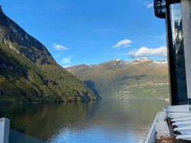 ...und sind dann mit den Außenaufzügen hoch auf Deck 15 gefahren. Meines Erachtens auf Prima/Perla der beste Platz, wenn es draußen was zu sehen gibt. Das Wetter hat absolut mitgespielt und die Fahrt durch den Fjord war, man kann es nicht anders sagen, ein beeindruckendes Erlebnis. Es stellte sich ein Gefühl der Glückseligkeit ein. Man kennt es vielleicht, wenn man so ein debil anmutendes Dauergrinsen im Gesicht hat. In etwa so war das. Ich lasse mal Bilder sprechen: