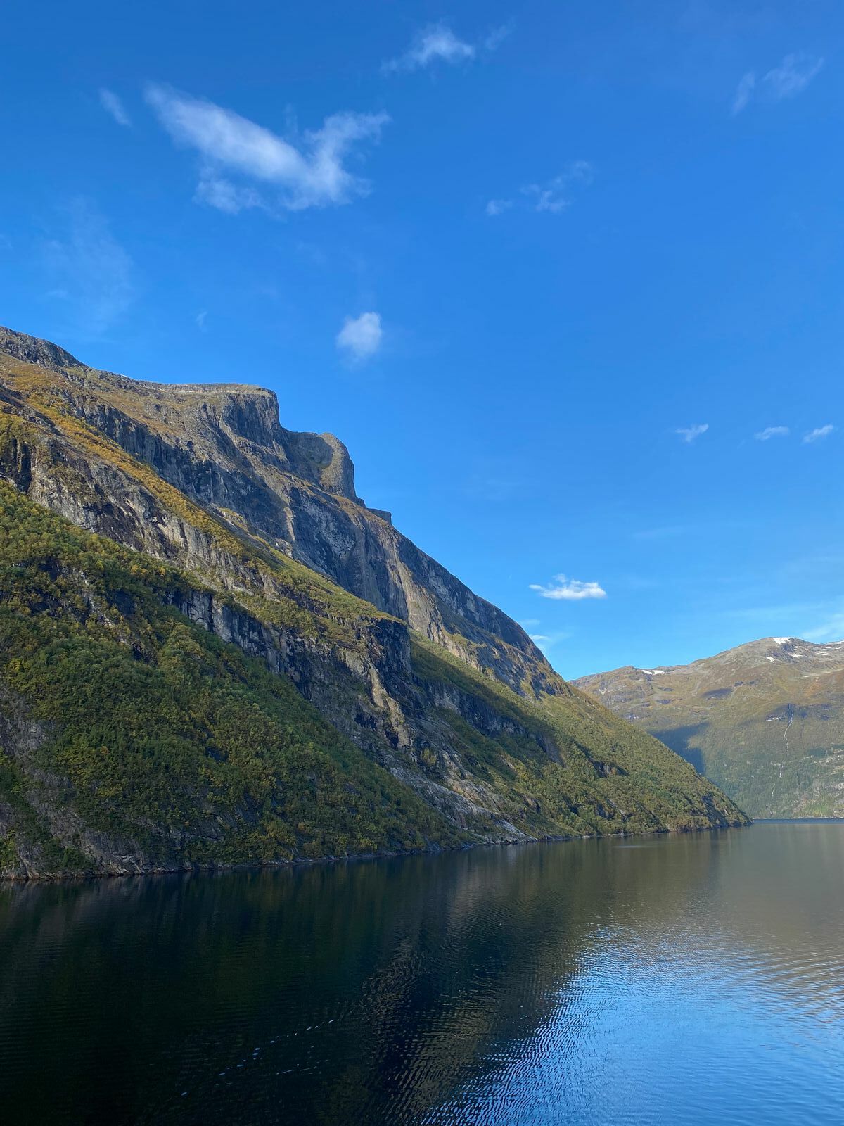 ...und sind dann mit den Außenaufzügen hoch auf Deck 15 gefahren. Meines Erachtens auf Prima/Perla der beste Platz, wenn es draußen was zu sehen gibt. Das Wetter hat absolut mitgespielt und die Fahrt durch den Fjord war, man kann es nicht anders sagen, ein beeindruckendes Erlebnis. Es stellte sich ein Gefühl der Glückseligkeit ein. Man kennt es vielleicht, wenn man so ein debil anmutendes Dauergrinsen im Gesicht hat. In etwa so war das. Ich lasse mal Bilder sprechen: