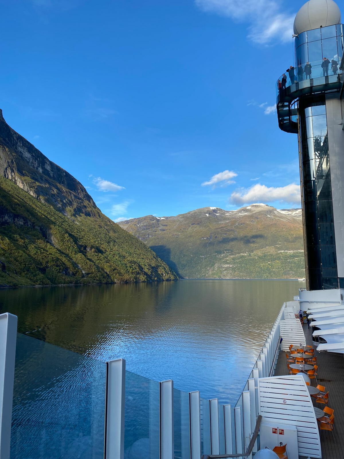 ...und sind dann mit den Außenaufzügen hoch auf Deck 15 gefahren. Meines Erachtens auf Prima/Perla der beste Platz, wenn es draußen was zu sehen gibt. Das Wetter hat absolut mitgespielt und die Fahrt durch den Fjord war, man kann es nicht anders sagen, ein beeindruckendes Erlebnis. Es stellte sich ein Gefühl der Glückseligkeit ein. Man kennt es vielleicht, wenn man so ein debil anmutendes Dauergrinsen im Gesicht hat. In etwa so war das. Ich lasse mal Bilder sprechen: