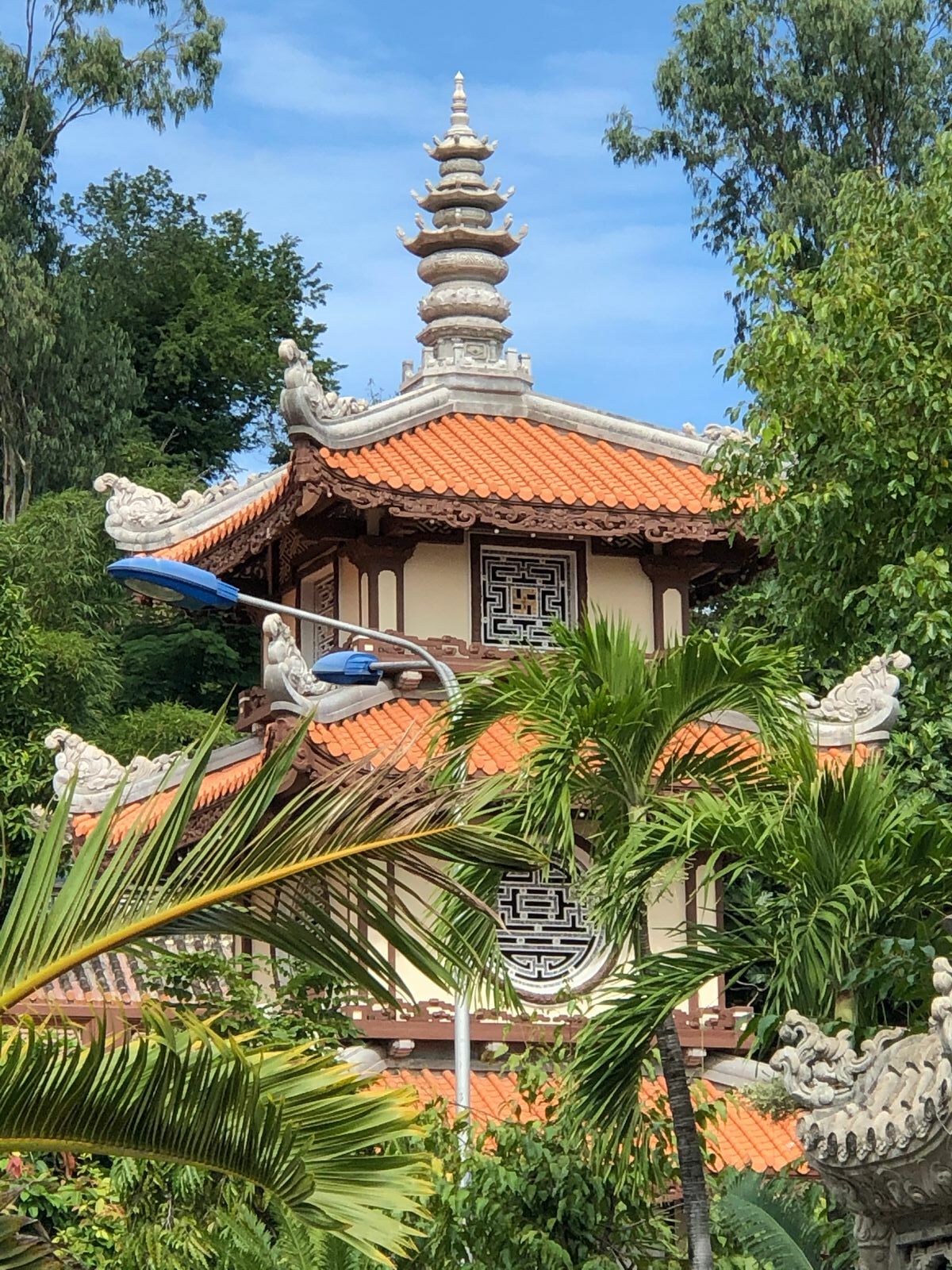 Da wir erst mittags in Nha Trang anlegten, frühstückten wir spät und beobachteten das Einlaufen von der Reling aus. Auch hier gab es wieder ein Riesenrad. Es befindet sich im Vergnügungspark Vinpearl auf einer Insel, zu der man auch wieder mit einer Seilbahn gelangen kann. Die Vita fuhr unter der Seilbahn durch und machte um 12 Uhr im Hafen fest. Hier war es mit 27° sehr schwül, der Himmel teils bedeckt, teils wolkenlos. Auch heute hatten wir wieder einen Ausflug mit „vietnamdreams-travel“ gebucht: „Nha Trang mit Strandbesuch“, der eine Stadtführung, Mittagessen und Strandbesuch mit Bademöglichkeit beinhaltete. Unsere Nachfrage bei der Buchung, wie der Ausflug stattfindet, wenn wir erst am Nachmittag ankommen, wurde so beantwortet, dass evtl. die Reihenfolge der Ziele sowie Mittag- mit Abendessen getauscht wird, ansonsten sei ein Nachmittagsausflug unproblematisch. Um 13 Uhr begann unser Ausflug, und…Überraschung…heute wieder mit Huu, den wir ja bereits von 2 Ausflügen kannten. Wir fuhren eine Viertelstunde verspätet los, da Huu noch auf 2 angemeldete Personen gewartet hat, die dann aber doch nicht erschienen sind. Zunächst fuhren wir zur Long Son Pagode, einer buddhistischen Tempelanlage. Die Pagode ist wie eine Ruheoase mitten in der quirligen Stadt. Bereits nach dem Eintreten durch das Eingangstor richteten sich die Augen direkt in den blauen Himmel, hier überragte ein riesiger weißer Buddha die Tempelanlage: