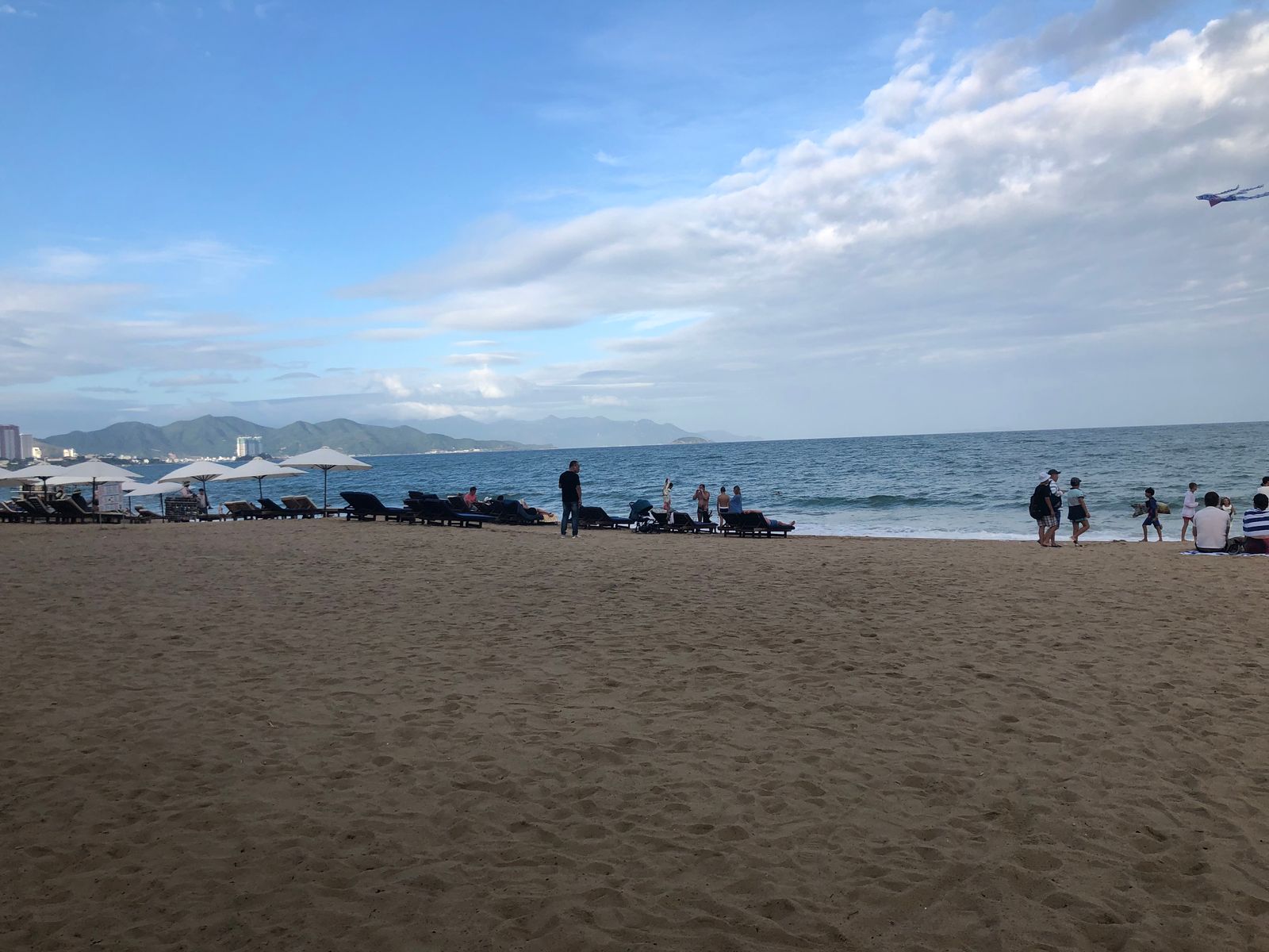 Wir hatten jetzt noch etwas Freizeit, um die Anlage zu erkunden, bevor es dann an den Strand ging. Wir fuhren zum Louisiana Brewhouse, das direkt am Strand liegt. Strandsachen hatten wir dabei, da der Ausflug ja mit „Nha Trang & Strandbesuch“ beworben und gebucht war. Allerdings war es bereits 16.15 Uhr als wir dort ankamen. Wir erhielten auf der Terrasse des Restaurants einen Drink, allerdings suchten wir die in der Ausflugsbeschreibung angekündigten Liegen am Strand vergeblich. Die Sonne stand schon so tief hinter den Hochhäusern, dass sie faktisch weg war, sodass der Strand komplett im Schatten lag und es fürs Schwimmen eigentlich zu kühl war. Einige wenige trauten sich trotzdem in das kühle Nass des Südchinesischen Meeres, so auch der Göttergatte, uns Frauen genügte es, mit den Füßen durch das Wasser zu laufen.