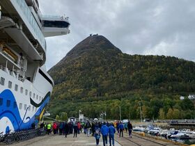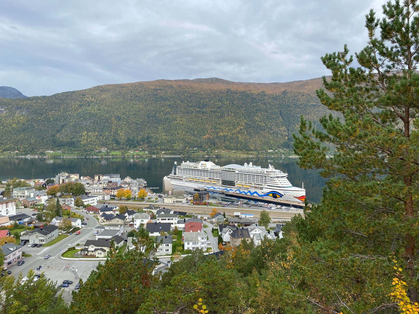 Von der Fahrt durch den Fjord bis zum Anlegen in Andalsnes haben wir leider gar nicht so viel mitbekommen. Im Hafen liegt man dann aber quasi direkt vor Bahnhof und Talstation der Romsdalsgondelen, die hinauf zum "Hausberg" Nesaksla führt.