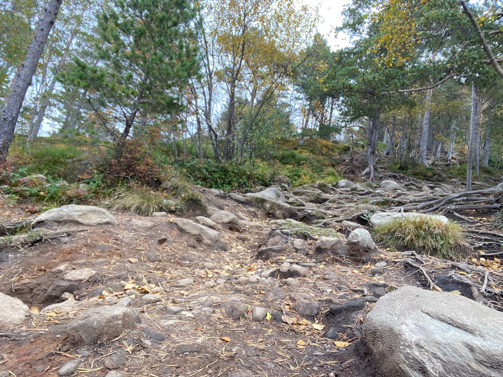 Es geht zunächst über angelegte Metallplatten hinauf und nach kurzer Zeit wird man in den Wald "ausgespuckt". Dort war ein Kindergartenausflug anzutreffen. Neutrale Beobachtung ohne Wertung: die Kinder in Andalsnes scheinen recht trittsicher im bergigen Geläuf zu sein. Einer der Betreuer stellte sich als emigrierter Deutscher heraus. Er schilderte, dass der Weg nach oben schön, aber auch sehr anstrengend sei.