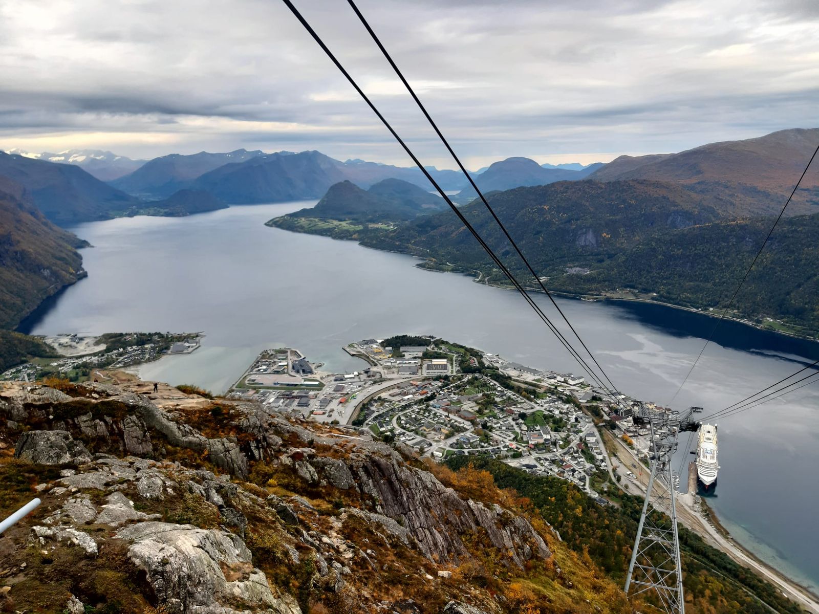 Besagte Seilbahn ist eine noch recht junge Attraktion und wurde erst im Jahr 2021 eröffnet und ist scheinbar die längste Seilbahn Norwegens. Auf 1676 Meter Länge werden in einer großen geschlossenen Gondel knappe 700 Höhenmeter hinauf zum Nesaksla überwunden. Wobei das Seil fast bis komplett nach oben frei in der Luft hängt. Beeindruckend...und gruselig, wenn man Höhenangst hat