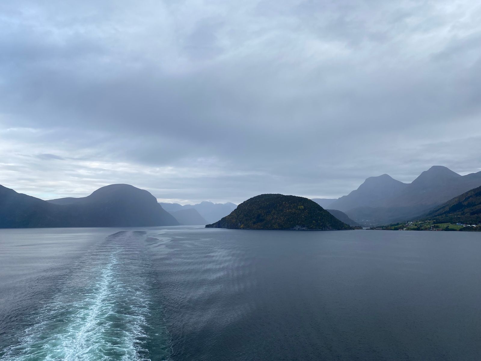 2 x Sail Away an einem Tag hat natürlich auch was. Dann ist es nicht so tragisch, wenn man das ganze nur vom Esstisch mitbekommt. Die kurze Fahrt zwischen Andalsnes und Molde wurde kindgerecht weitgehend auf Deck 14 verbracht. Papa und Mama konnten sich aber ab und an mal für eine Runde über Deck ausklinken. Die aufziehenden Wolken ließen die Umgebung recht mystisch erscheinen.