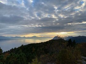 Hab ich in diesem Blog eigentlich schon erwähnt, dass das herbstliche Licht und die Farben der Natur diese Reise ganz besonders gemacht haben? wenn nicht, sei es somit kundgetan. Der Weg nach oben, vom Schiff sollten es ca 4 Kilometer sein, zog sich allerdings gefühlt wie Kaugummi. Und mindestens einer der 4 Wanderer hat abwechselnd oder gleichzeitig Anzeichen von Unmut ob des weiteren Aufstiegs bekundet. Die Wanderung selbst war eigentlich gar nicht so anspruchsvoll. Egal ob im Wald oder auf der Straße, man hatte durchgehend feste Wege. Es ging allerdings zwischendurch immer mal wieder stramm nach oben. Aber wir hatten ja ein Ziel. Ich zitiere mal aus dem Reiseführer: "Von oben ist Molde besonders schön. Der Berg Varden ist 407 Meter hoch. Bei klarem Wetter bietet sich von oben eine überwältigende Aussicht auf die Stadt, die Fjorde mit den Schäreninseln und die mehr als 200 teilweise schneebedeckten Gipfel der Sunnmøre-Alpen. Das Panorama gilt als eines der schönsten Norwegens."