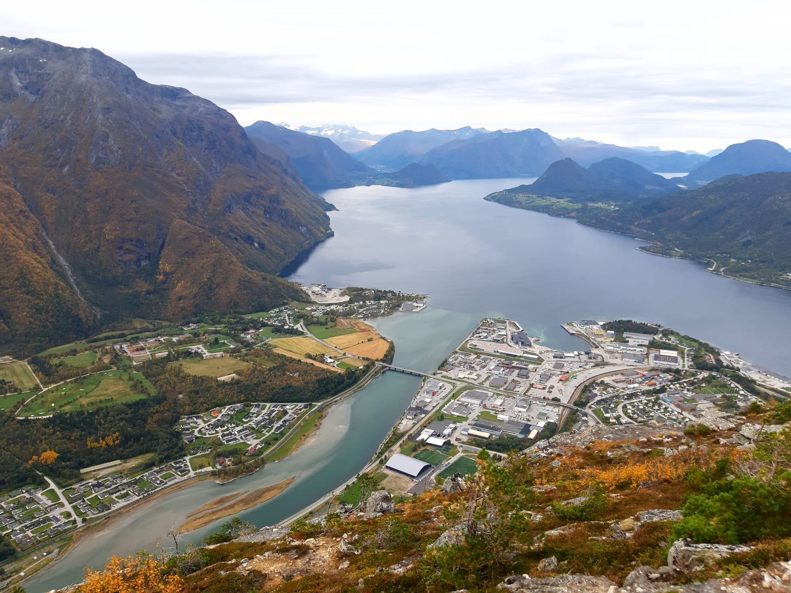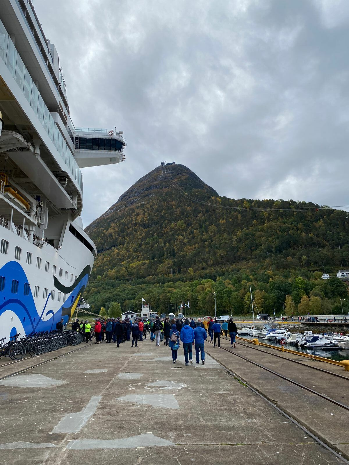 Von der Fahrt durch den Fjord bis zum Anlegen in Andalsnes haben wir leider gar nicht so viel mitbekommen. Im Hafen liegt man dann aber quasi direkt vor Bahnhof und Talstation der Romsdalsgondelen, die hinauf zum "Hausberg" Nesaksla führt.
