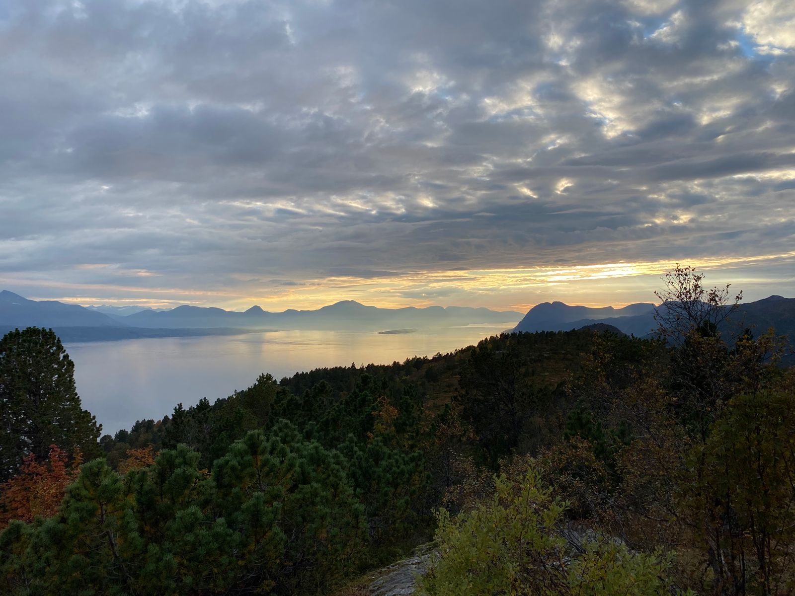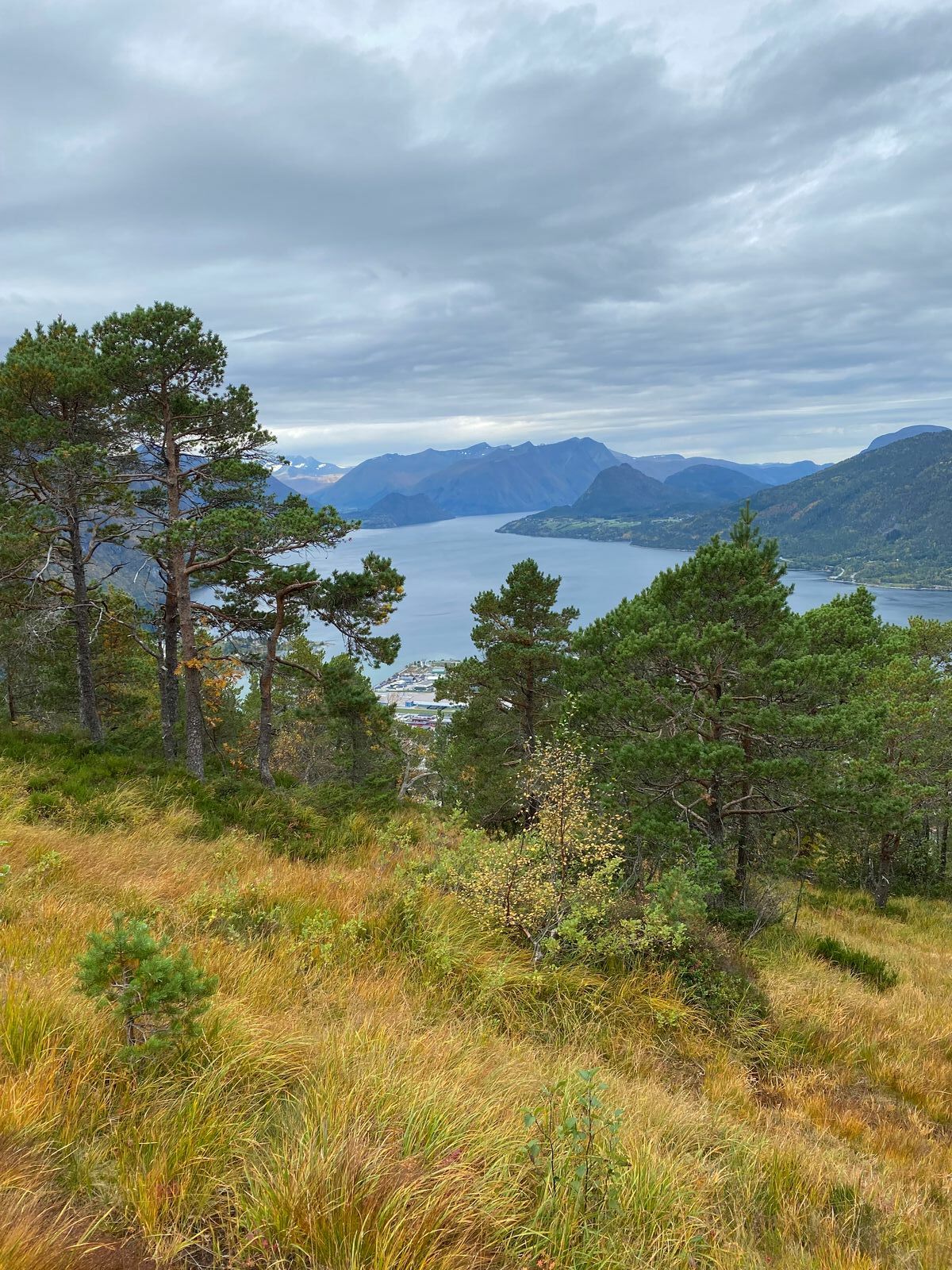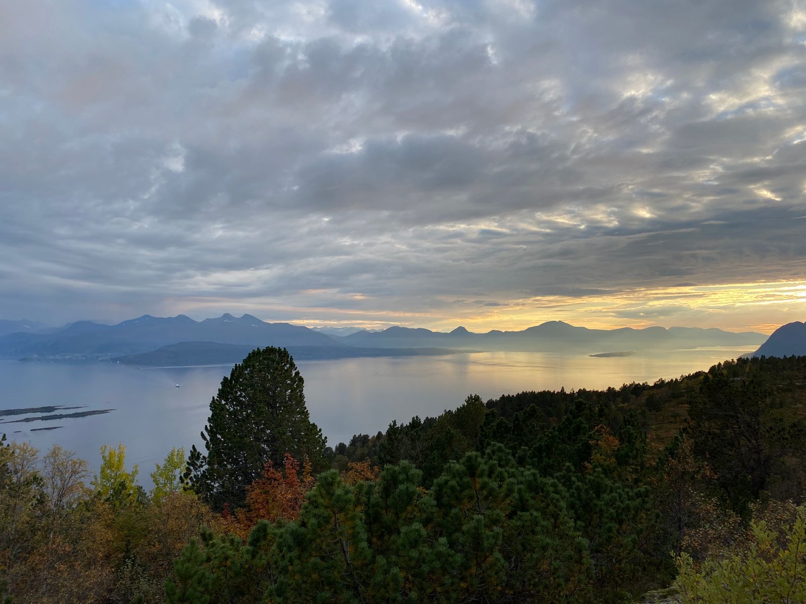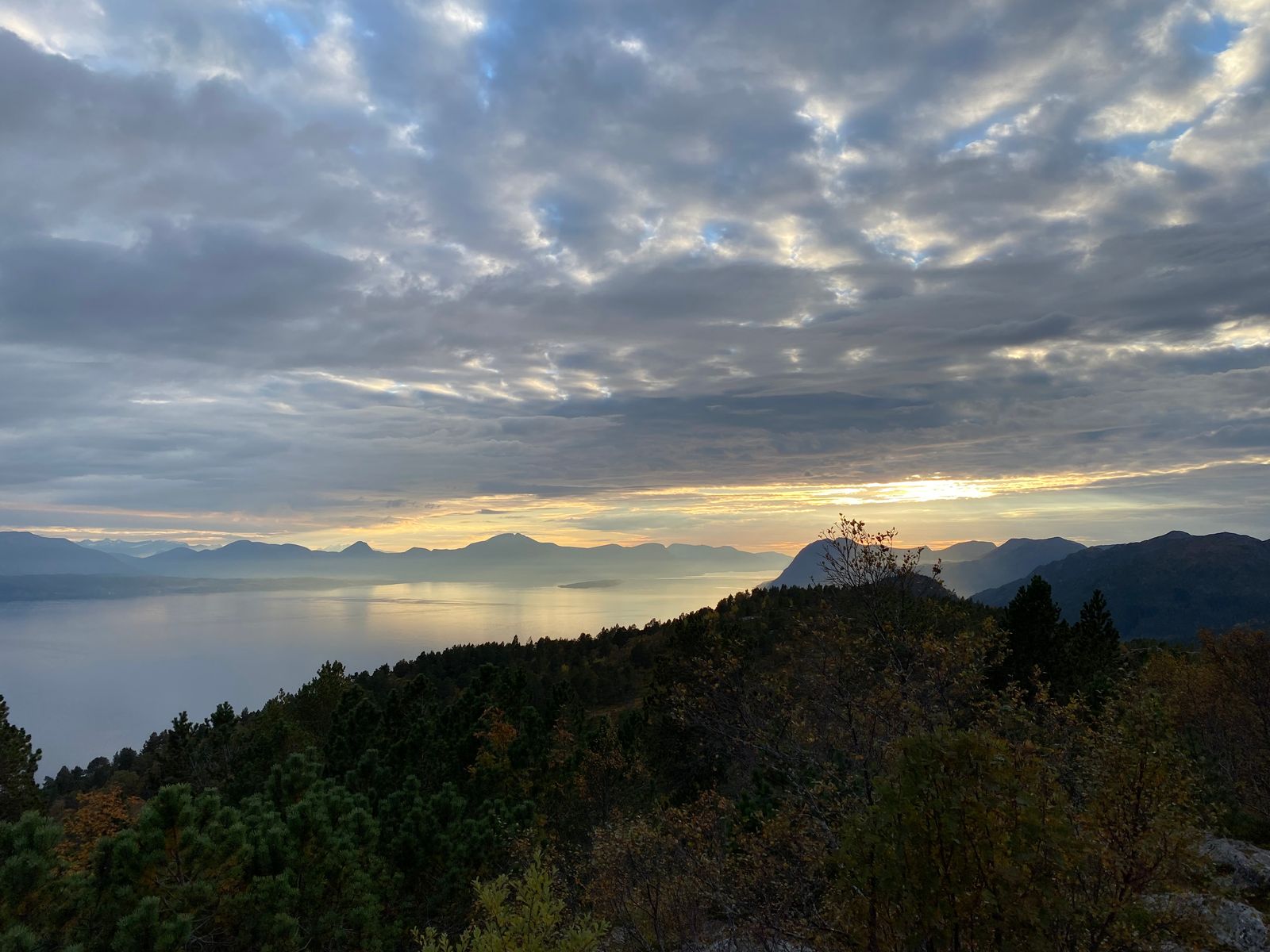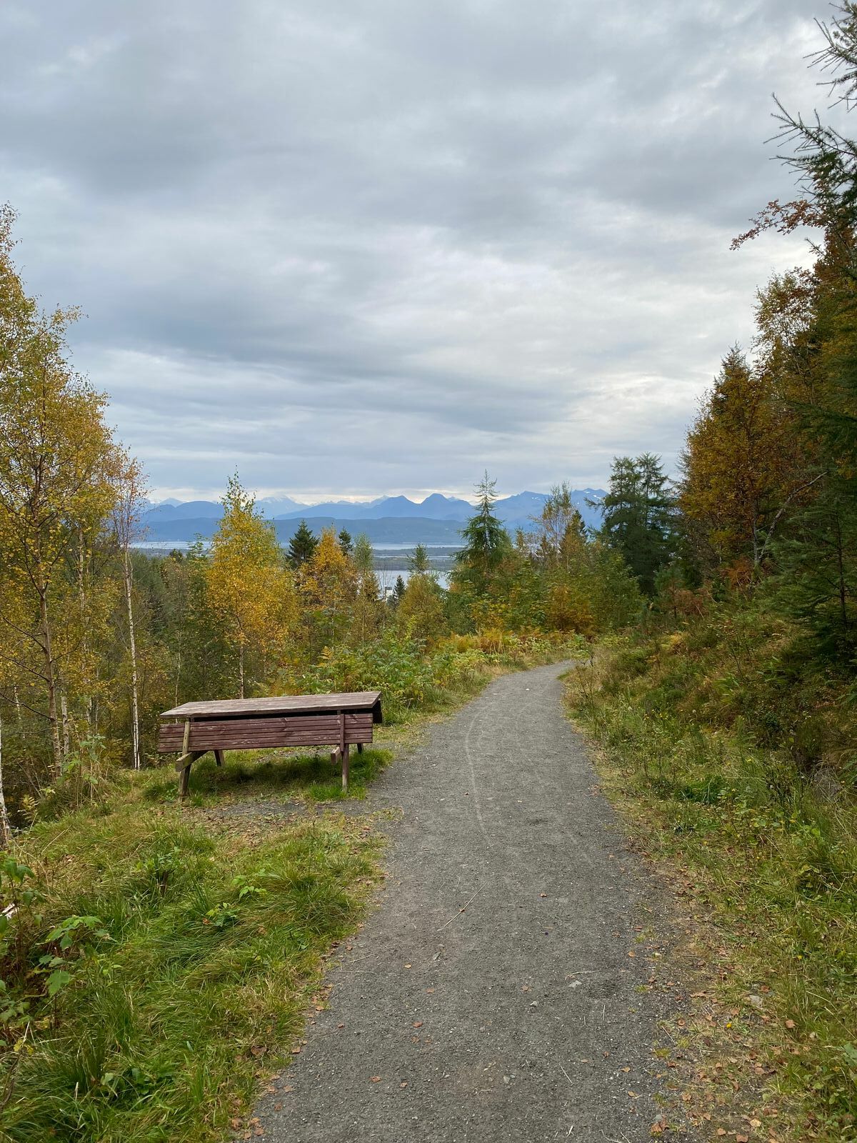 Hab ich in diesem Blog eigentlich schon erwähnt, dass das herbstliche Licht und die Farben der Natur diese Reise ganz besonders gemacht haben? wenn nicht, sei es somit kundgetan. Der Weg nach oben, vom Schiff sollten es ca 4 Kilometer sein, zog sich allerdings gefühlt wie Kaugummi. Und mindestens einer der 4 Wanderer hat abwechselnd oder gleichzeitig Anzeichen von Unmut ob des weiteren Aufstiegs bekundet. Die Wanderung selbst war eigentlich gar nicht so anspruchsvoll. Egal ob im Wald oder auf der Straße, man hatte durchgehend feste Wege. Es ging allerdings zwischendurch immer mal wieder stramm nach oben. Aber wir hatten ja ein Ziel. Ich zitiere mal aus dem Reiseführer: "Von oben ist Molde besonders schön. Der Berg Varden ist 407 Meter hoch. Bei klarem Wetter bietet sich von oben eine überwältigende Aussicht auf die Stadt, die Fjorde mit den Schäreninseln und die mehr als 200 teilweise schneebedeckten Gipfel der Sunnmøre-Alpen. Das Panorama gilt als eines der schönsten Norwegens."