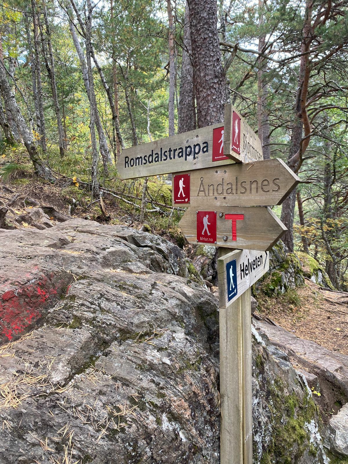 Es geht zunächst über angelegte Metallplatten hinauf und nach kurzer Zeit wird man in den Wald "ausgespuckt". Dort war ein Kindergartenausflug anzutreffen. Neutrale Beobachtung ohne Wertung: die Kinder in Andalsnes scheinen recht trittsicher im bergigen Geläuf zu sein. Einer der Betreuer stellte sich als emigrierter Deutscher heraus. Er schilderte, dass der Weg nach oben schön, aber auch sehr anstrengend sei.