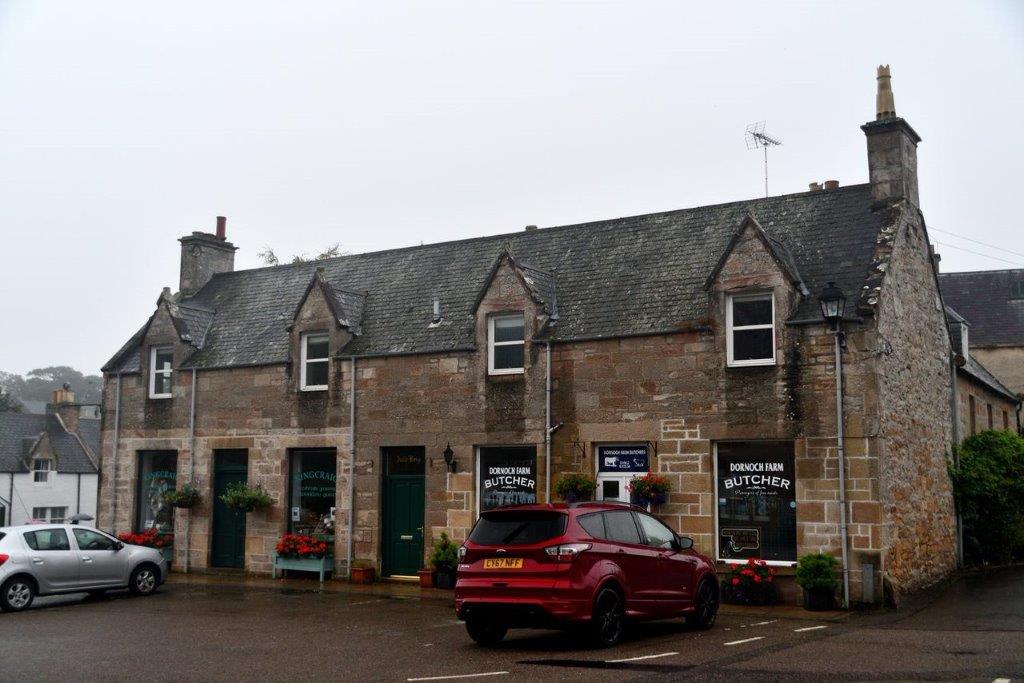 Nach dem Frühstück begann unser Ausflug. Hurra! Im Bus war es trocken! Draußen nicht. So verließen wir bei Regenbegleitung die von Industrie geprägte Stadt. Die Landwirtschaftszone Ostschottlands begann. Abgeerntete oder für das Mühen bestimmte Getreidefelder. Wiesen und Weiden mit Schafen oder Rindern. Vereinzelt Mischwälder. Alles grün – das milde, auch vom Golfstrom verursachte Klima und der Regenreichtum war dafür verantwortlich. Wir durchfuhren nur wenige kleine Ortschaften, wie z.B. die für ein hoch wirksames medizinisches Produkt bekannte Glenmorangie. Einige Minuten später überquerten wir den Dornoch Firth und befanden uns auf einmal im verregneten Dornoch. Ein bei gutem Wetter mit Sicherheit reizendes Örtchen. Aber nicht an diesem Tag.
