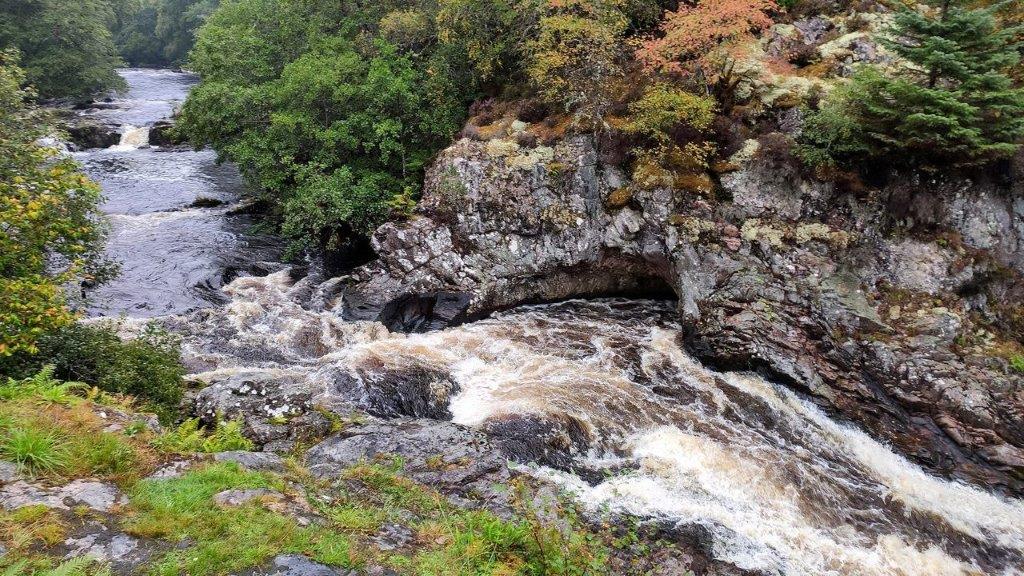 Ob wir Lachse beobachten konnten? Zunächst der Hinweis, dass es immer noch regnete. Schottenwetter live … Trotzdem ließen wir es uns nicht nehmen, einen gut befestigten Weg bis zu einem Aussichtspunkt oberhalb der Falls zu nutzen.