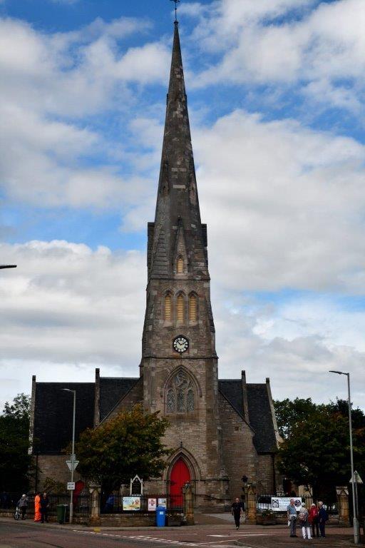 Ebenso die Wiesen, Weiden und Wälder auf der anderen Seite des Cromarty Firth. Diesen Zustand mussten wir einfach nach einem schnellen Mittagessen im Gosch nutzen. Hinein ins nahe Stadtzentrum von Invergordon! Was gab es dort zu sehen? Zunächst die Invergordon Parish Church mit dem hohen, alles überragenden schlanken Turm.