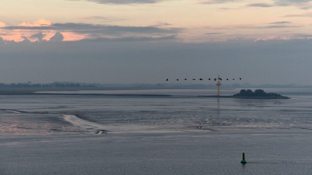 Am frühen Morgen ein Blick nach draußen: Wir fuhren noch. Irgendwo im Bereich der Wesermündung. Ein Grund, sich mit der Morgentoilette zu beeilen, zumal der Morgenkaffee lockte. Oben angekommen, musste der Kaffee zurückstehen. Der Grund: