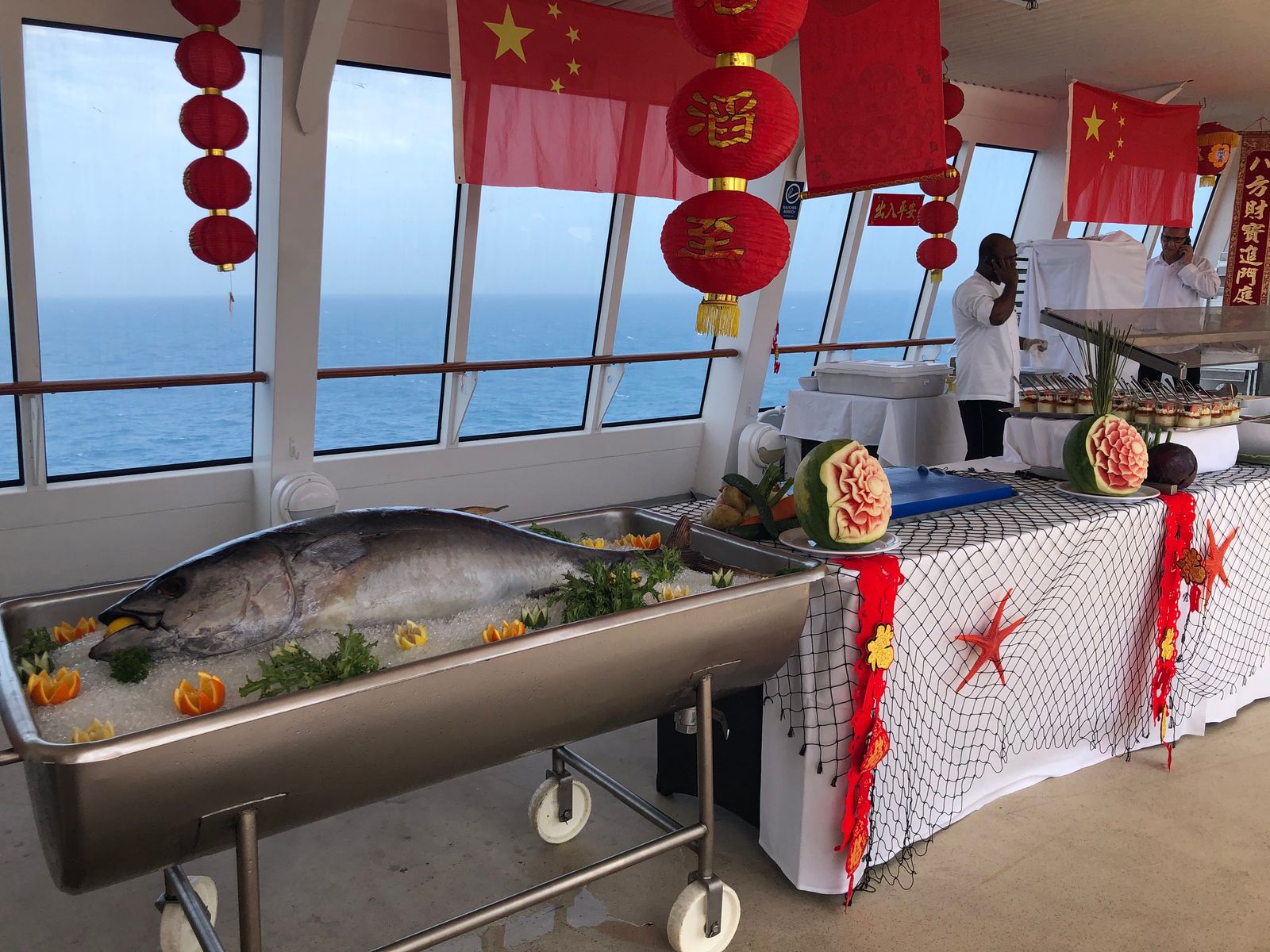 In der Nacht wurden die Uhren von 2 auf 3 Uhr eine Stunde vorgestellt. Da Seetag war, konnten wir die „verlorene“ Stunde länger schlafen und frühstückten dann später gemütlich auf der Außenterrasse des Calypso. Das Wetter war sehr schön und sonnig, die Temperaturen lagen bei 30°C. Nach den letzten anstrengenden quirligen Tagen in Saigon das richtige Wetter zum Ausspannen am Pool. Um die Mittagszeit wurde wieder ein Poolbrunch angeboten, diesmal mit frischem Thunfisch. Dabei wurde Vorort ein kompletter Thunfisch zerlegt und die einzelnen Stücke gegrillt. Es schmeckte sehr lecker.