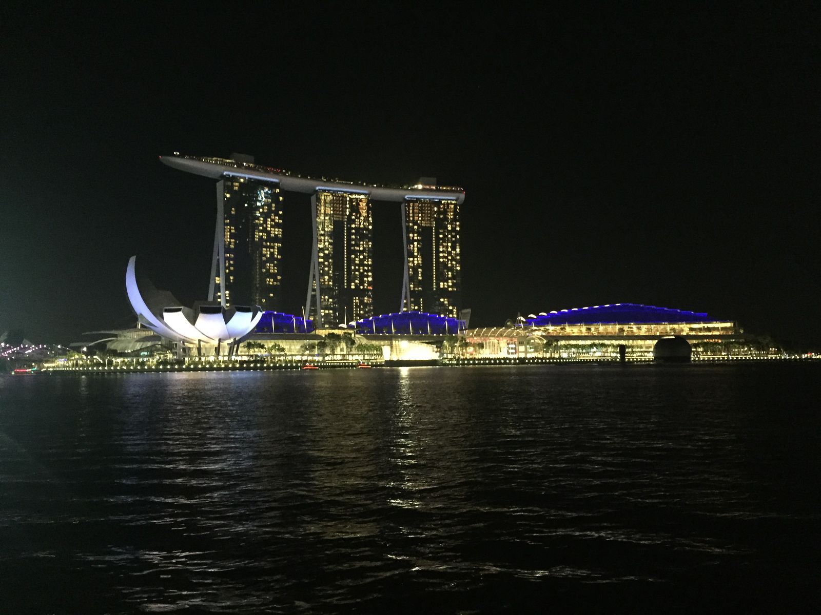 Direkt am MerLion ist ein Anleger für die „Singapore River Cruise“ mit einem Bumboat. Das war doch genau das Richtige für uns. Die nächste Tour startete ein paar Minuten später. Wir kauften Tickets und starteten um 21.45 Uhr. Herrlich, wir saßen entspannt im Boot und sahen die schön angestrahlten Gebäude des Kolonialviertels an uns vorbeiziehen. Außerdem kamen wir am Clarke Quay vorbei, zwar nur im Boot, aber aufgrund unseres Zeitfensters in Singapur stand dieser nicht auf unserem Programm und so hatten wir wenigstens einen kleinen Einblick auf das wuselige Treiben dort. Nach einer ¾ Stunde legten wir wieder beim MerLion an. Entlang der Fullerton Esplanade bestaunten wir immer wieder den tollen Blick auf die toll erleuchtete Marina Bay mit dem Herzstück, dem Marina Bay Sands Hotel.