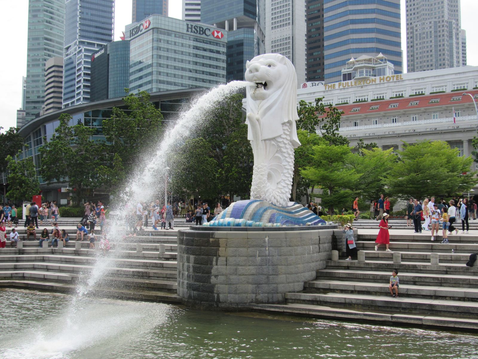 Das Marina Bay Sands Hotel ist bekannt für seine außergewöhnliche Architektur. Es besteht aus drei nebeneinanderstehenden Hoteltürmen, die oben durch eine Schiffskonstruktion miteinander verbunden sind. Dadurch sieht das Dach des Hotels wie ein Schiff aus. Dort oben befindet sich im 56. Stock der SkyPark, von welchem eine tolle Aussicht versprochen wird. Dieser war unser nächstes Ziel. Um zum Marina Bay Sands Hotel zu gelangen, mussten wir jedoch die halbe Bay umrunden. Unterwegs kamen wir am MerLion, dem Wahrzeichen Singapurs vorbei: