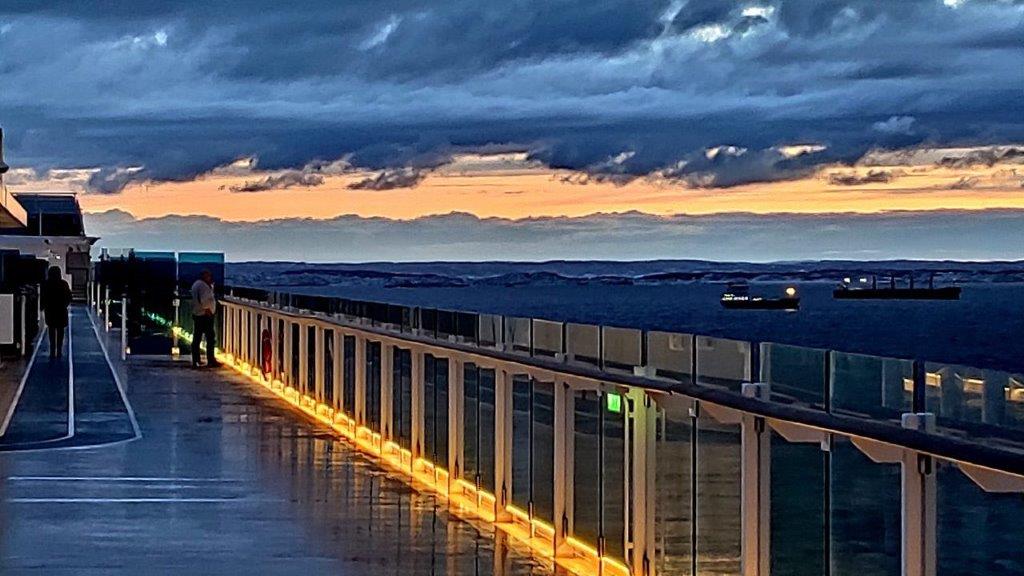 vor der – extra für uns bestellt! – ein Shuttlebus wartete. Und es dauerte nicht lange bis wir auf dem Schiff waren. Nach einer kurzen Ausruhphase verlangten unsere Körper einen Wachmacher. Nicht einen starken Kaffee – frische Luft. Wir gehorchten wie (fast) immer und stiefelten auf Deck 14. Immerhin noch + 3°, starker Wind mit der Folge, dass die Müdigkeit schnell verschwand.