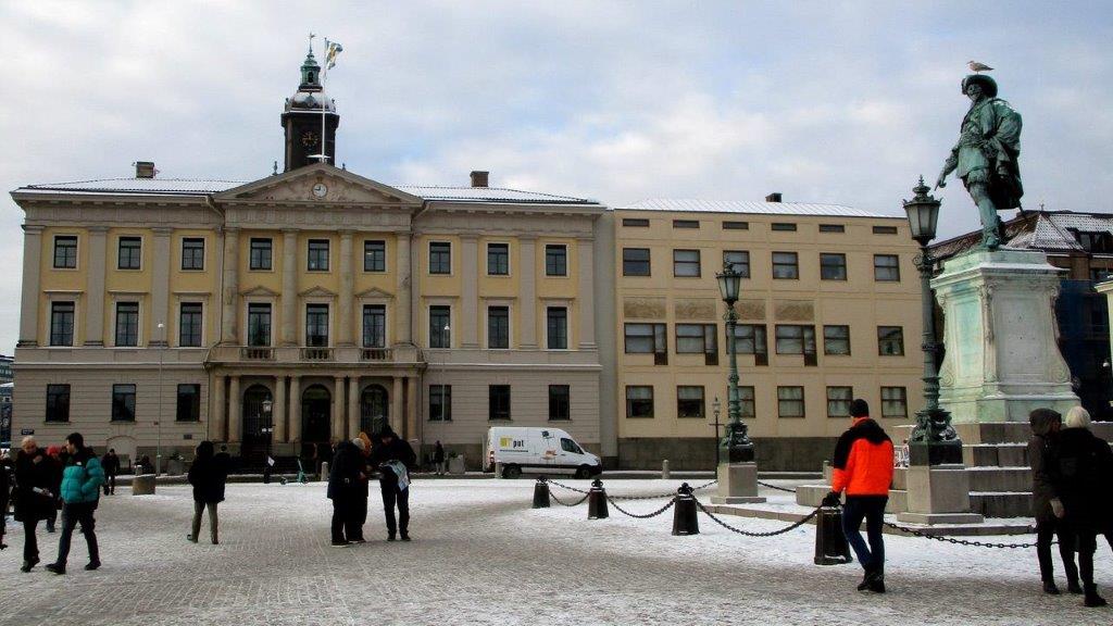 Hauptperson auf diesem Platz ist – na, wer wohl? – natürlich unser alter Schwede Gustav II. Adolf, stocksteif seit 1854 auf einem Sockel stehend und ein wenig eingezäunt – nicht füttern! Interessant ist, dass die Statue die dritte Version ist. Das erste Standbild wurde von einer römischen Firma in Bronze gegossen. Nur die Legierung war nicht die beste – der Guss ging voll daneben. Anschließend fabrizierte eine Münchner Firma eine neue Statue. Der Guss gelang, Gustav Adolf fuhr quer durch Deutschland, wurde verschifft und … das Schiff sank. Ein Bronzeguss war nicht eben billig, also wurde Gustav Adolf von nach Lohn Lechzenden wieder aus dem Wasser in die Welt gehievt. Aber die Finder verlangten einen derartig hohen Finderlohn, dass sich die Stadtväter sagten, dass Gustav Adolf ihnen nicht so viel wert sei. Ergo: es wurde ein dritter Gustav Adolf gefertigt (bitte nicht fragen, von wem – wahrscheinlich zur Minimierung der Material- und Transportrisiken von einem heimischen Unternehmen) und dieser Gute steht seitdem oben auf seinem Sockel und schaut auf die von ihm gegründete Stadt … oder eher bis zu den Begrenzungen seines Platzes. Dazu gehört die ehemalige Börse. Von deren oberen schneeweißen Fassade schauen sechs Grazien auf das an diesem Tag nicht sehr ausgiebige Treiben herab. Sie symbolisieren Fleiß, Glück (daraus machte man später einfach Frieden), Handel, Seefahrt, Reichtum und Industrie. Die Börse wurde drei Jahre nach der endgültigen Version Gustav II Adolfs fertig gestellt. Links von der Börse schließt sich das einstige Stadtshuset an; beide Gebäude dienen heute der Stadtverwaltung. Außerdem bestaunt Gustav (na, lassen wir nun den Adolf) das ehemalige Rathaus aus dem Jahre 1672, in dem zeitweise (hoffentlich) Recht gesprochen wurde.