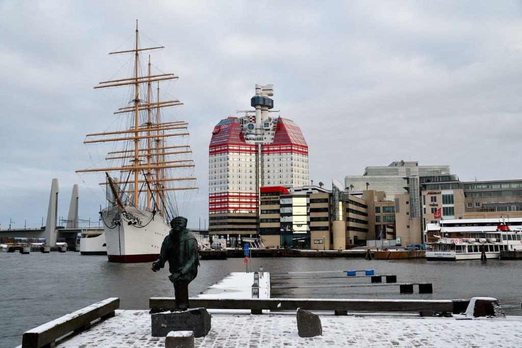Nein, ein Hochhaus. Was denn nun? Na ja, eine gewisse Ähnlichkeit besteht schon … Vor dem Lippenstift lag das seit Jahren fest vertäute Segelschiff Barken Viking. Es wird sicher noch Jahre so bleiben, denn die Masten sind höher als die in Richtung Kattegat zu bewältigende Brücke … aber dafür kann man auf dem Schiff übernachten – es ist ein 4-Sterne-Hotel auf dem Wasser!