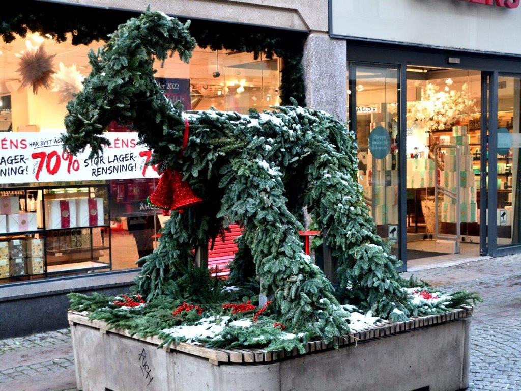 Weniger von Mein Schiff - Passagieren (zwar waren einige anwesend), sondern von der Stadtbevölkerung. Wir entvölkerten durch unser Verlassen der Markthalle das Gebäude und suchten den Weg zu einer in den letzten Jahren bevorzugten Sehenswürdigkeit, dem Stadtteil Haga. Zunächst durch kleine Sträßchen, die geprägt waren von festlich geschmückten Geschäften mit zum Glück von uns allen vernachlässigten Sonderangeboten. Bewacht wurden die Läden von einem grünen Rentier: