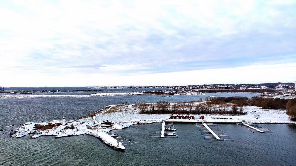Schwedisch. Holzhäuschen, eine spärlich genutzte Marina, Schären, Schnee. Sogar ein riesiger Fleck blauen Himmels. Noch … Und wir froren dort oben – eiskalt. Ein Foto vom Bug aus sparen wir uns. Wir lagen am Rande des Industriegürtels vom größten Hafen Schwedens. Nicht so prickelnd …