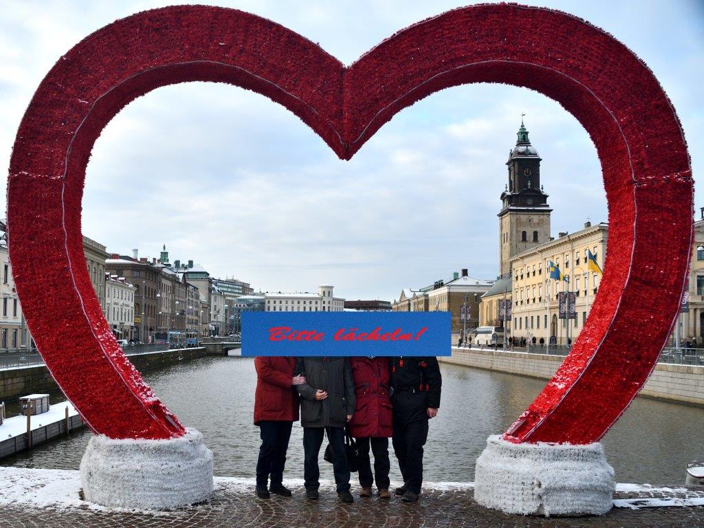 Dieses Herz musste ausgefüllt werden. Ausgefüllt mit wichtigeren (na ja …) Personen als Gustav. Wir stellten uns gerne zur Verfügung und ließen uns rot einrahmen vor einem imposanten Hintergrund – links und rechts vom Kanal alte, wunderbar in Schuss gehaltene Herrschaftshäuser und mittendrin die Tyska Kyrkan, die Deutsche Kirche, als älteste Kirche der Stadt.