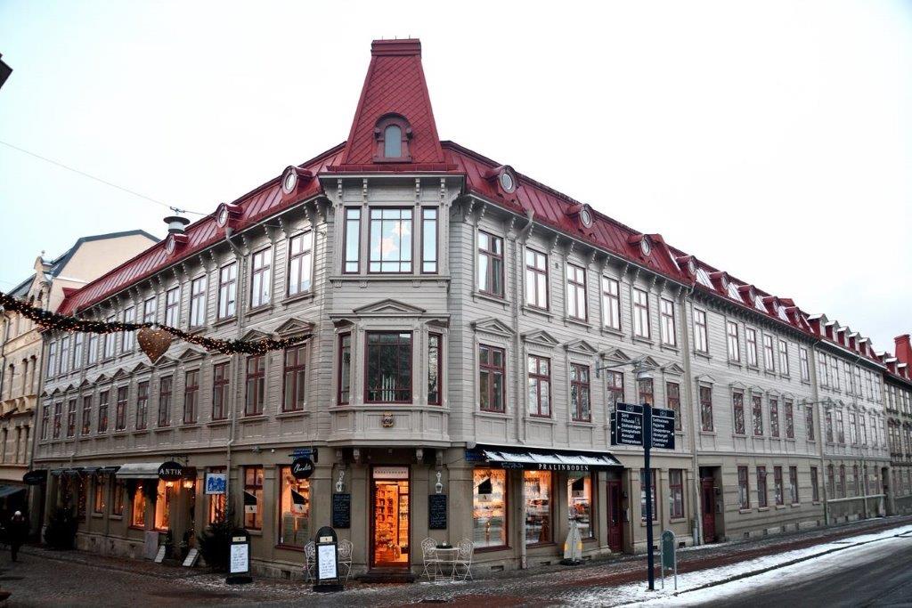 Hauptperson auf diesem Platz ist – na, wer wohl? – natürlich unser alter Schwede Gustav II. Adolf, stocksteif seit 1854 auf einem Sockel stehend und ein wenig eingezäunt – nicht füttern! Interessant ist, dass die Statue die dritte Version ist. Das erste Standbild wurde von einer römischen Firma in Bronze gegossen. Nur die Legierung war nicht die beste – der Guss ging voll daneben. Anschließend fabrizierte eine Münchner Firma eine neue Statue. Der Guss gelang, Gustav Adolf fuhr quer durch Deutschland, wurde verschifft und … das Schiff sank. Ein Bronzeguss war nicht eben billig, also wurde Gustav Adolf von nach Lohn Lechzenden wieder aus dem Wasser in die Welt gehievt. Aber die Finder verlangten einen derartig hohen Finderlohn, dass sich die Stadtväter sagten, dass Gustav Adolf ihnen nicht so viel wert sei. Ergo: es wurde ein dritter Gustav Adolf gefertigt (bitte nicht fragen, von wem – wahrscheinlich zur Minimierung der Material- und Transportrisiken von einem heimischen Unternehmen) und dieser Gute steht seitdem oben auf seinem Sockel und schaut auf die von ihm gegründete Stadt … oder eher bis zu den Begrenzungen seines Platzes. Dazu gehört die ehemalige Börse. Von deren oberen schneeweißen Fassade schauen sechs Grazien auf das an diesem Tag nicht sehr ausgiebige Treiben herab. Sie symbolisieren Fleiß, Glück (daraus machte man später einfach Frieden), Handel, Seefahrt, Reichtum und Industrie. Die Börse wurde drei Jahre nach der endgültigen Version Gustav II Adolfs fertig gestellt. Links von der Börse schließt sich das einstige Stadtshuset an; beide Gebäude dienen heute der Stadtverwaltung. Außerdem bestaunt Gustav (na, lassen wir nun den Adolf) das ehemalige Rathaus aus dem Jahre 1672, in dem zeitweise (hoffentlich) Recht gesprochen wurde.
