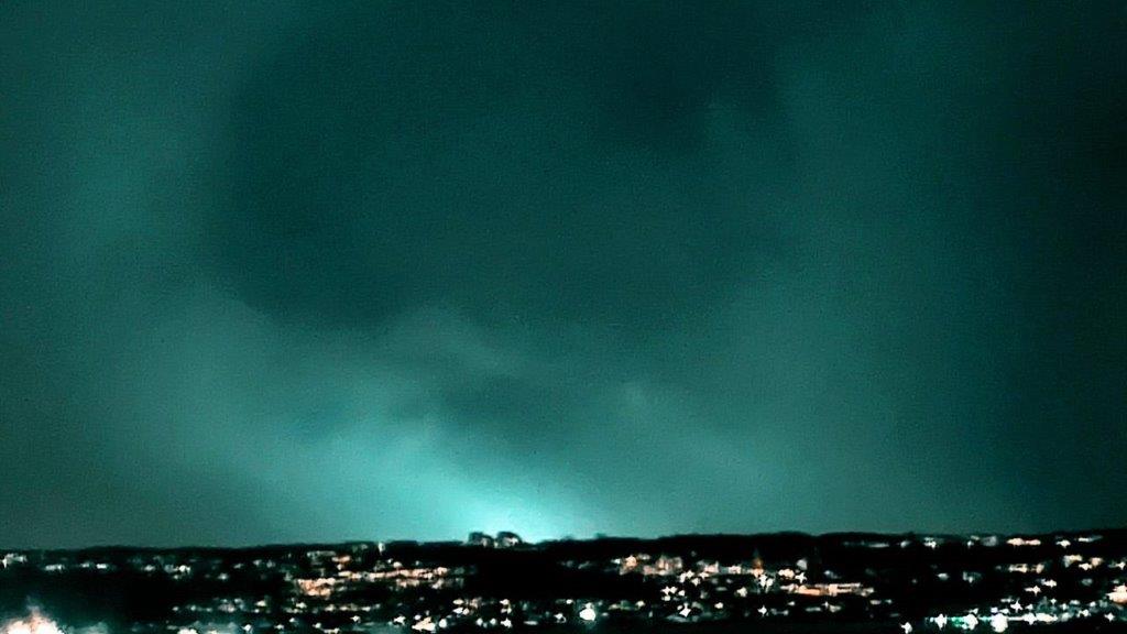 Also Zeit, sich unter Deck wieder aufzuwärmen und danach wieder nach oben zu gehen. Zunächst gab es leichten, dann starken Schneefall. Leichte Böen gingen zu starken Böen über. Und weit weg über Göteborg gab´s eine Himmelerscheinung.