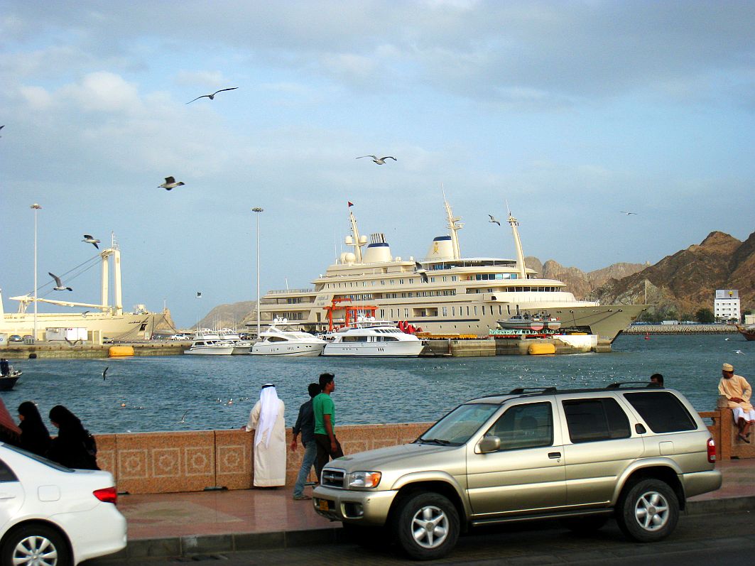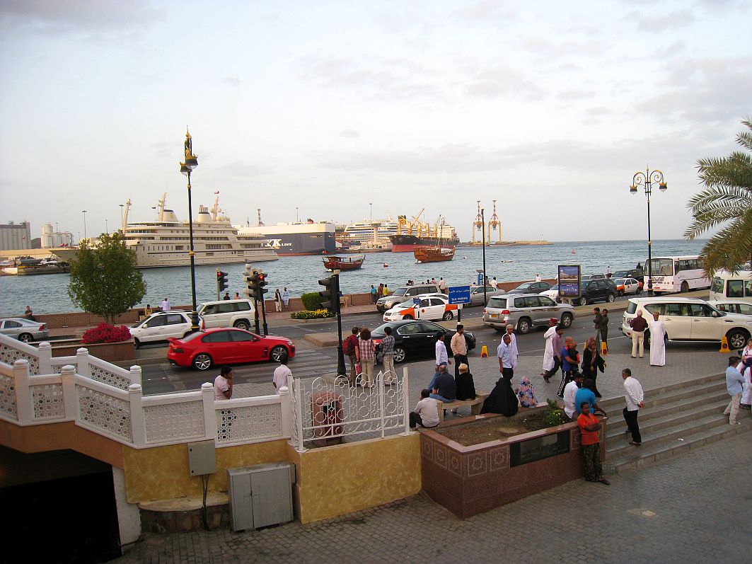 Um mich außen noch etwas umsehen zu können, bevor wir zum Schiff zurückfahren, verlasse ich den omanischen Basar und wende mich dem Treiben auf der Corniche zu. Zwischen der Yacht des Sultans und einem Frachtschiff entdecke ich aus dieser Perspektive auch einen Teil unserer AIDAblu.