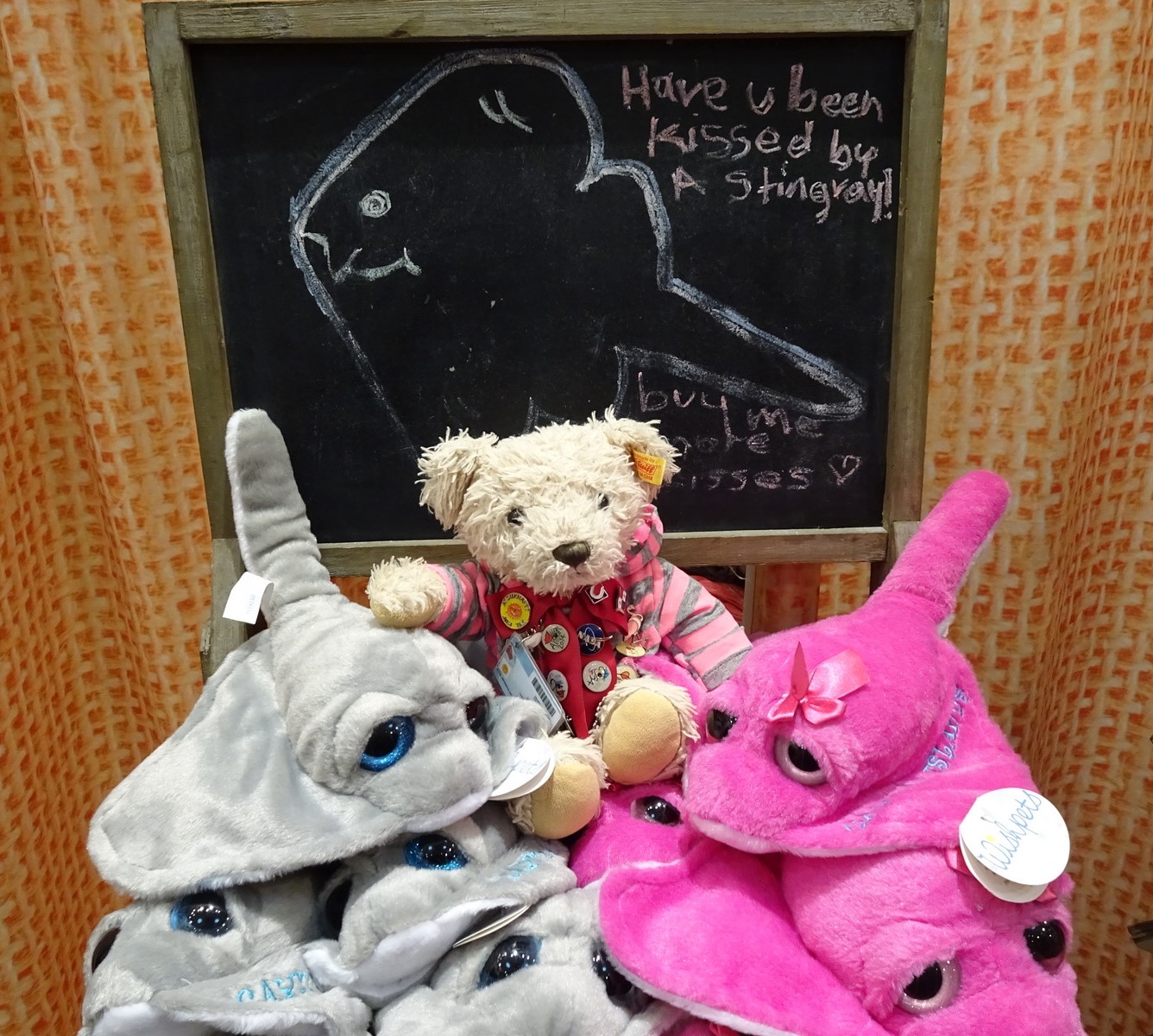 Nicht alle, sondern nur ich Teddymädchen werde jetzt noch Opfer von plumper Anmache, als ich hier aufgefordert werde, mir Küsse von einem Rochen zu kaufen.