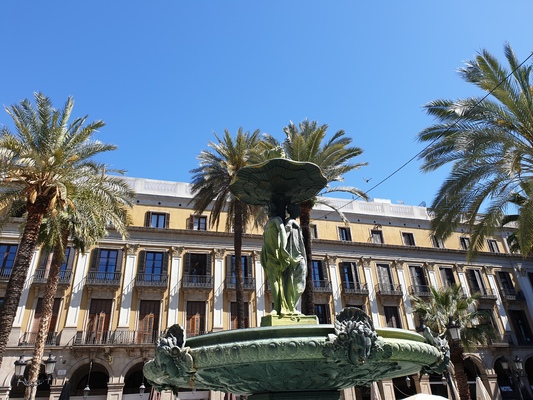 Unter den Arkaden befinden sich verschiedene Restaurants, Bars, Cafe's und in der Mitte ist der Brunnen der drei Gracien. Ich bin wieder total begeistert. Der Platz strahlt so eine harmonische Ruhe aus und die zwei mächtigen sechsarmigen Straßenlaternen runden das Bild ab. Es sind Kunstwerke von Antonio Gaudi, der auch der Archtitekt der Sagrada Familia war. Im Schatten der großen Palmen verweilen wir einen Moment und lassen die Aura des Platzes auf uns wirken.