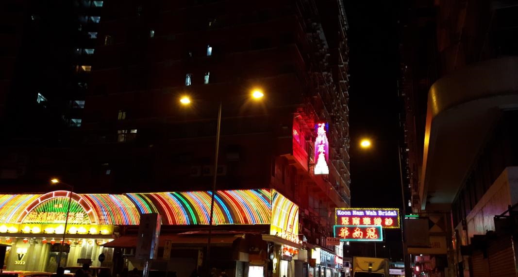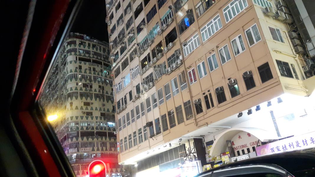 Flughafen. Wir restlichen vier setzen uns in die Taxe und es geht zum Temple Street Night Market. Unterwegs mache ich noch ein paar Fotos von den Straßenschluchten.