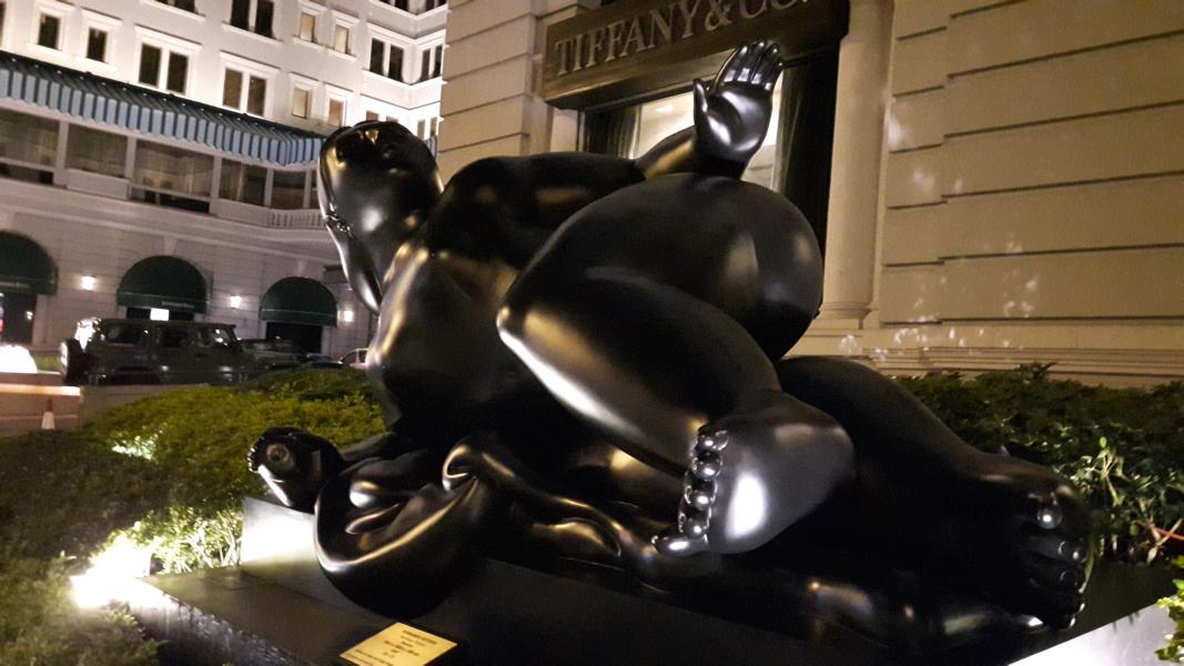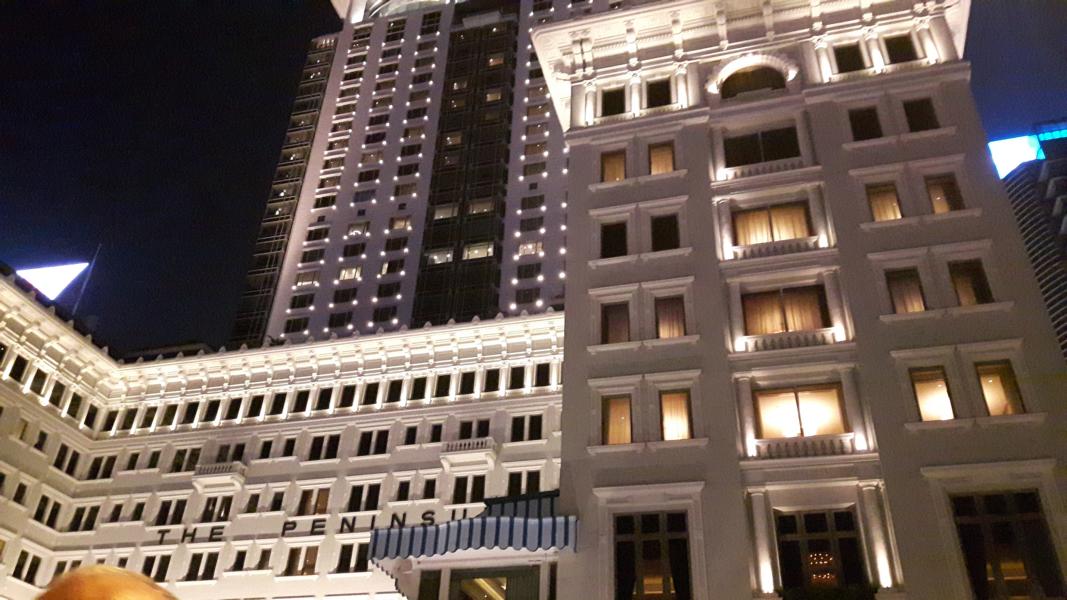 Jetzt sind wir an der Vorderseite des Peninsula angekommen. Welch eine schöne Fassade und da liegt doch tatsächlich eine Dame im Park.