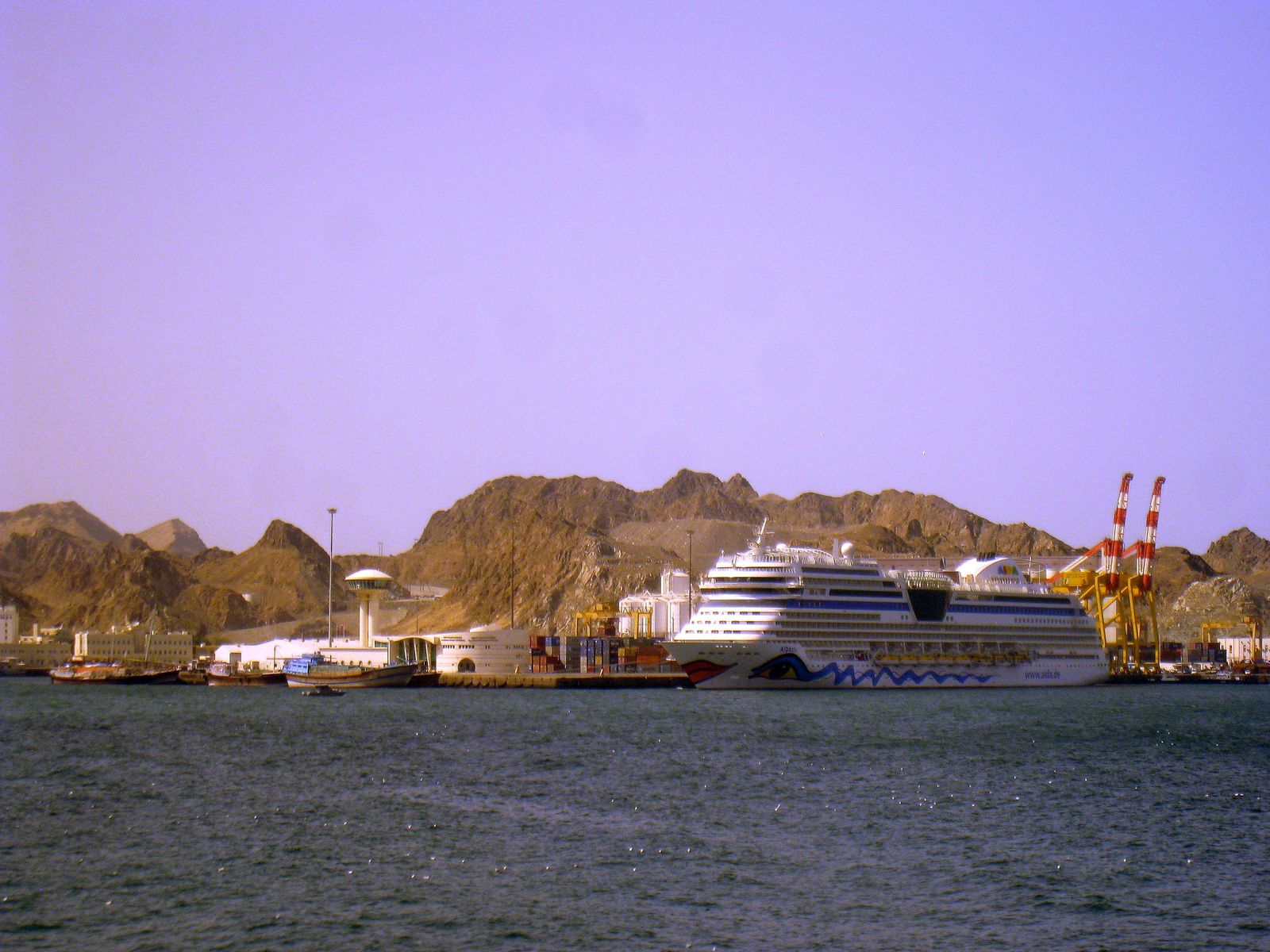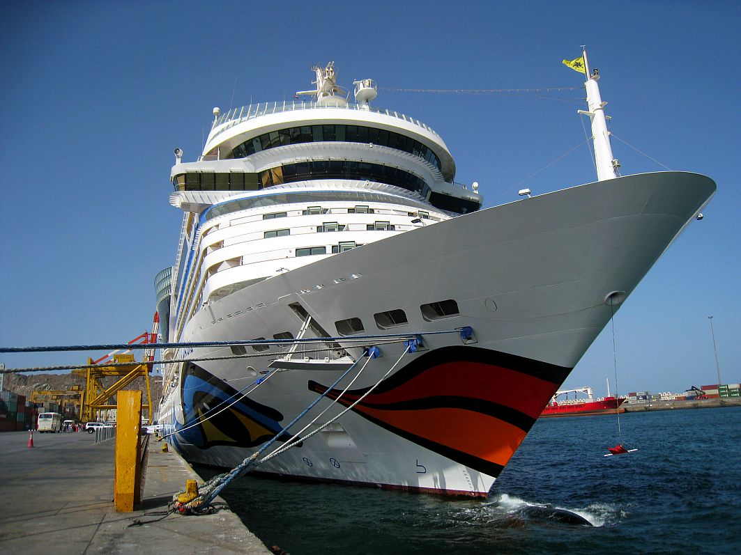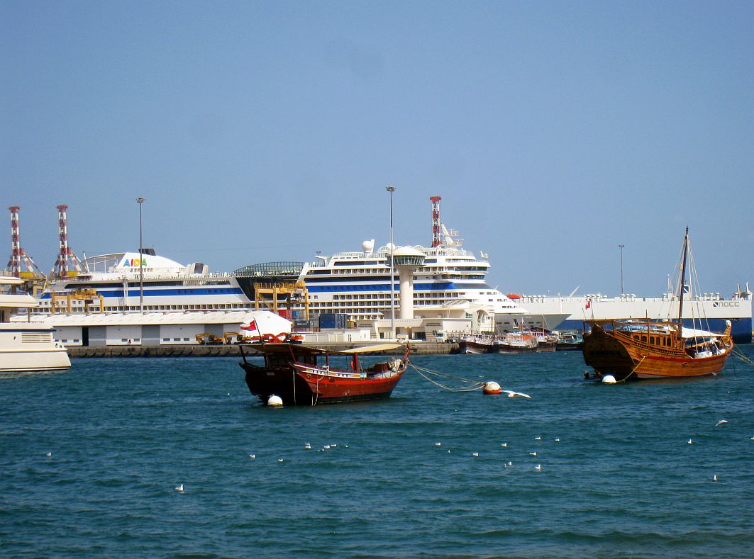 Alt und neu – Traditionelle arabische Holzboote – die „Dhaus“ – umrahmen unsere gerade einmal zwei Jahre junge AIDAblu: