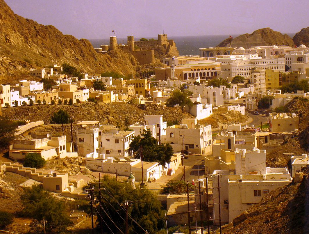 Weiter geht’s auf unserer Tour durchs „Mystische Muscat“. Vor der Weihrauchschale biegen wir ab auf die älteste (und wahrscheinlich engste und kurvenreichste) Straße von Muscat. Auf einer Anhöhe haben wir einen wunderschönen Blick auf die Festungen Mirani und Jalali sowie Teile des Palastes von Sultan Qaboos. Leider dürfen wir nicht aussteigen, somit verfälschen die getönten Busscheiben dadurch den tollen Ausblick, was dann so aussieht: