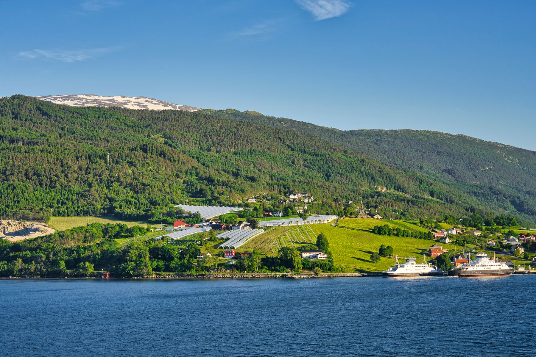 Fjordfähren im Abendlicht. Und ein Obst- und Gemüsebetrieb.