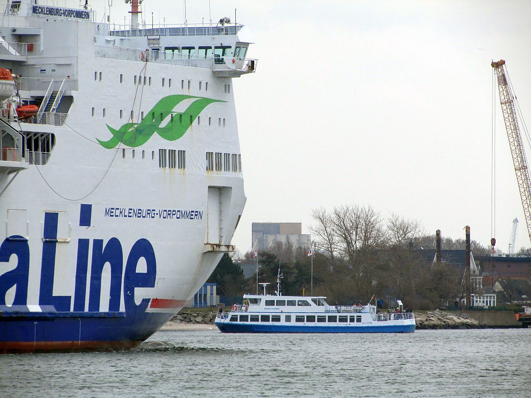 Ich bin überrascht, als ich keine Auslaufmelodie höre. Schade, ich hatte mich schon innerlich darauf eingestellt. Meine Enttäuschung geht jedoch schnell vorüber und ich bin angenehm überrascht, als ich über den Bordfunk plötzlich die Stimme des Kapitäns höre. Wahnsinn, und das mitten im Ablegemanöver. Das verdient zweifellos höchsten Respekt. Der Mann ist ein Genie. Ablegen, manövrieren, sich auf den starken Schiffsverkehr auf dieser Route konzentrieren und dann noch die Passagiere unterhalten. Und was hier für ein Verkehr herrscht: Blindfische, bleierne Enten, Nussschalen, kleinere Kreuzfahrtschiffe, Ozeanriesen. Ob auch U-Boote dabei waren, kann ich nicht sagen. Wenn sie auf Tauchfahrt sind, sieht man sie so schlecht. Und die vor ein paar Tagen frisch gehobene „Titanic“ kam vor wenigen Minuten auch vorbei – in Richtung Stadthafen Rostock. Hing zwar noch bisschen Seetang dran, ein paar Krustentiere weigerten sich auch beharrlich, den Rumpf zu verlassen und hatten sich dort extra festgeklebt. Aber ansonsten kann man über ihren Zustand nicht meckern.