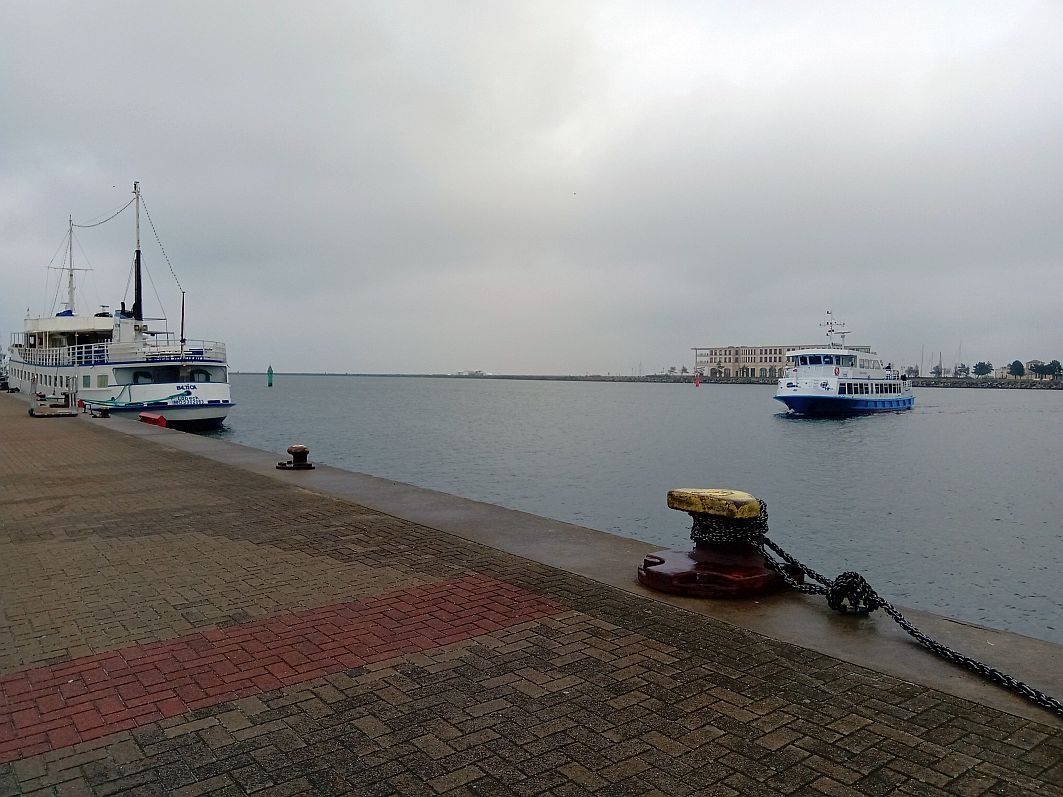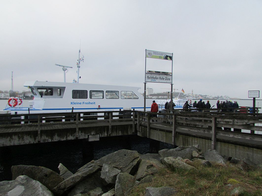 Kaum komme ich am Riesenrad und Bier-Gaudi und Brezel-Brotzeit vermittelnden, derzeit jedoch noch im Winterschlaf befindlichen Gute-Laune-Gelände des „Hanse-Rades“ vorbei, schon sehe ich das Schiffchen – Noch nicht?! Also, das heißt, noch nicht direkt, sondern erst einmal noch winzig klein am scheinbar Lichtjahre entfernten Cruise Terminal „Hohe Düne“. Aus dieser Entfernung wird schnell klar, wie klein es tatsächlich ist. Und man kann die „Kleine Freiheit! erst einmal auch nur ganz verschwommen erkennen.