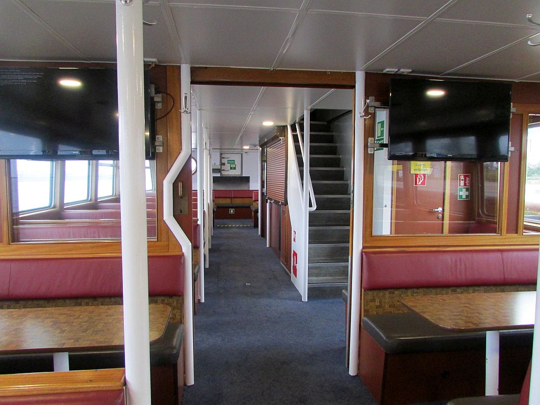 Kurz vor dem Ablegen habe ich die Möglichkeit, einen Teil dieser Innenkabinen kurz zu besichtigen. Einfach sind sie und sie verströmen ein wenig Jugendherbergs- oder Landschulheim-Ambiente. Aber völlig ausreichend. Eigentlich hält man sich dort ja sowieso nur zum Schlafen auf. Aber wenn man es genau nimmt, sind es eigentlich Außenkabinen mit eingeschränkter Sicht, denn jede Innenkabine hat ein Fenster. Klasse, und auch hierfür kein Aufschlag. Vielleicht sollte ich es mir fürs nächste Mal echt überlegen mit so einer Innenkabine.
