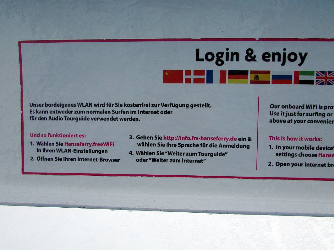 Vorhin berichtete ich ja von dem unschlagbaren Reisepreis von 1,70 €. Es wird sogar noch besser, in diesem wirklich mehr als günstigen Preis ist sogar bereits kostenfreies WLAN enthalten, wie ich auf einem der zahlreich überall angebrachten Schilder auf meinem Weg zur Reling lesen kann: