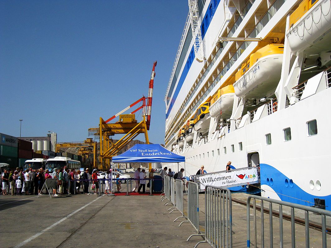 So sehr ich mich auf meine Rückkehr auf mein „schwimmendes Zuhause in der Fremde“ freue – trotzdem wende ich mich mit Wehmut dem schönen Kussmundschiff zu: Mit diesem Gang zurück an Bord unserer schönen AIDAblu verlasse ich omanischen Boden, verlasse ich ein faszinierendes, facettenreiches und geheimnisvolles Land im Orient. Zunächst war ich ein wenig traurig, als „Captain Out“ im Theatrium die Umroutung und den damit verbundenen Wegfall von Bahrain verkündete. Doch kaum, als ich begann, auf den Spuren Sindbads zu wandeln, war ich unglaublich froh, nunmehr zwei Tage im Oman verbringen zu dürfen. Diese sind leider nunmehr schon wieder vorbei. Und einmal mehr habe ich das Gefühl, dass sich im Urlaub die Zeiger der Uhr schneller drehen oder die Tage weniger als 24 Stunden haben. Anders kann ich mir das rasante Verfliegen der schönen Stunden nicht erklären.