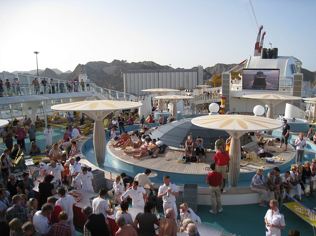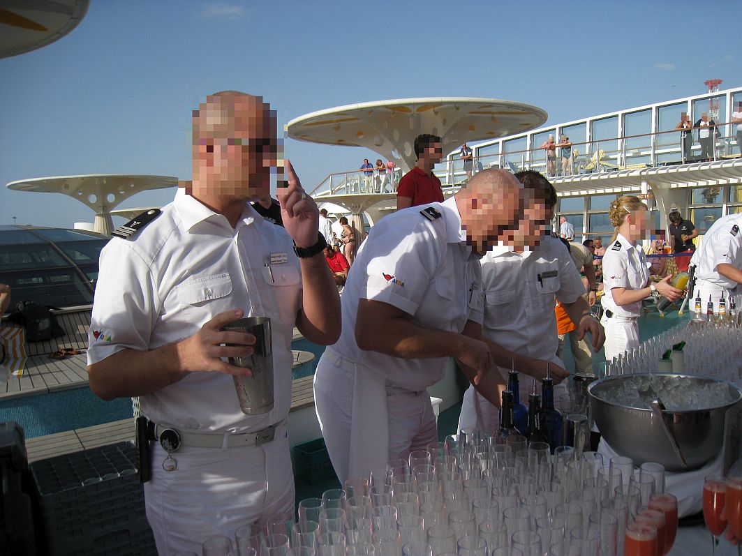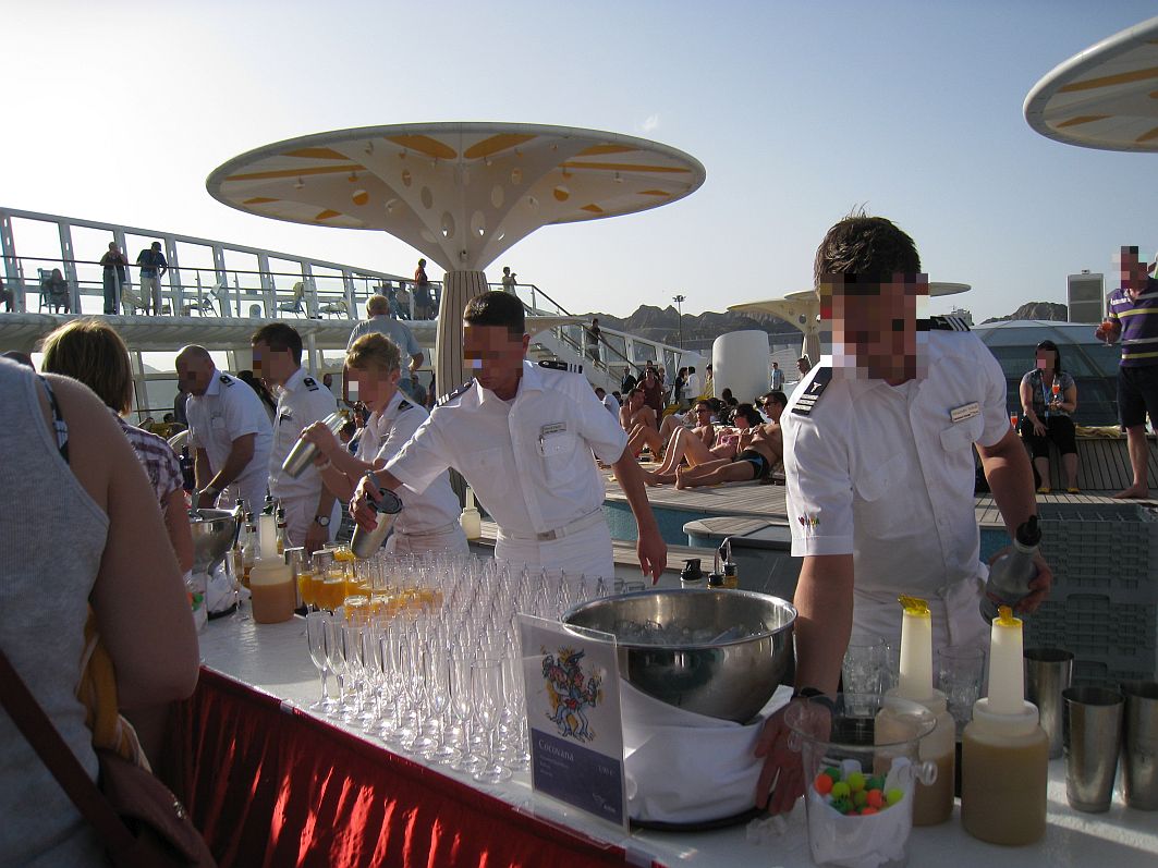Den Nachmittag verbringe ich auf dem Pooldeck, da mein Backbord-Balkon um diese Tageszeit im Schatten liegt. Ab 16:00 Uhr wird’s so richtig feucht-fröhlich: Herzlich willkommen zum großen Offiziers-Shaken! Die sommerlichen Temperaturen schreien richtig nach einem kühlen Cocktail. Also schnell in eine der Schlangen eingereiht, die sich gebildet haben, um in den Besitz der bunten Flummis zu kommen, die einem das „Tor zur Cocktailbar“ und leckeren Getränken wie „Seemannsbraut“ oder „Cocovana“ öffnen.