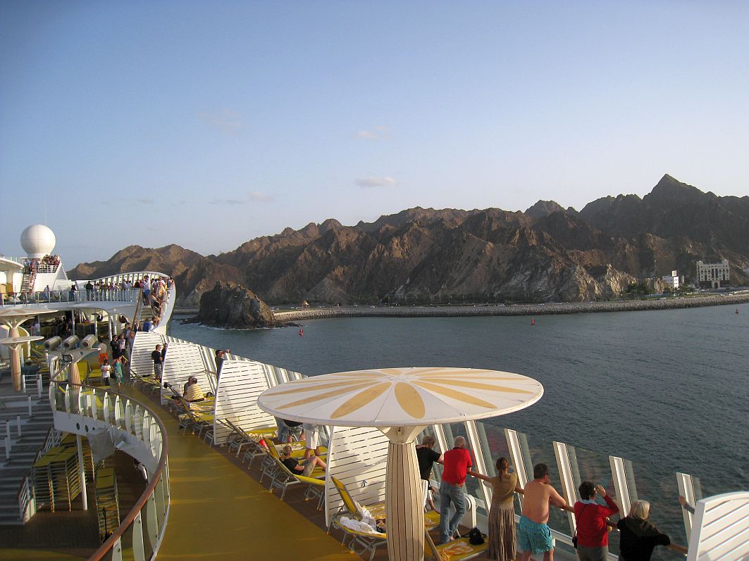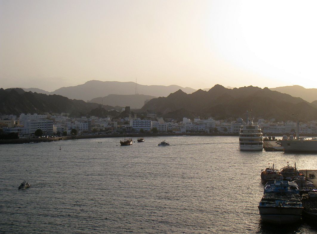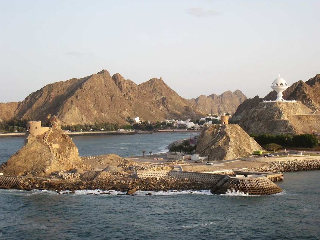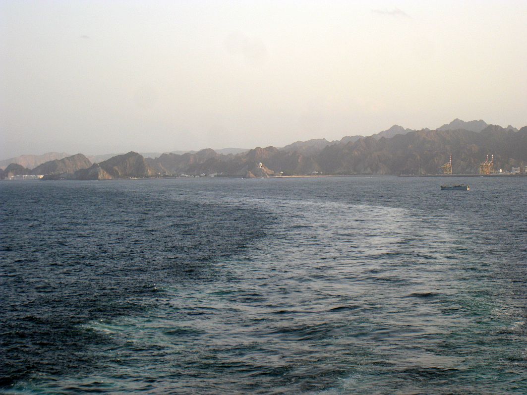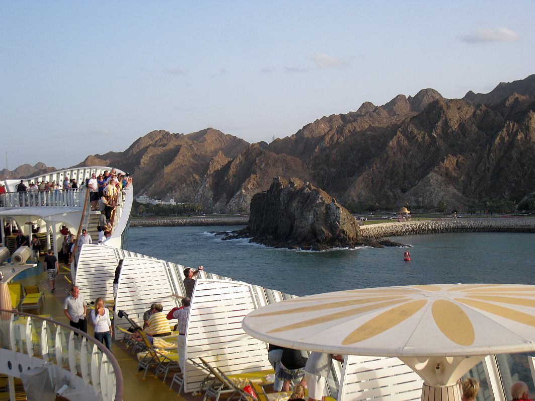 „Sail Away, Muscat! Ma Salama, Oman!“ – Das Ablegen ist für mich jedes Mal ein total emotionaler Moment und so kann und will ich mir auch dieses Mal die eine oder andere Träne nicht verkneifen. Ich denke, für diese Gefühle muss man sich nicht schämen. Die traumhafte Landschaft mit den zerklüfteten Felsen, an die sich die kleinen weißen Häuser Muscats schmiegen, ziehen an uns vorbei, die Weihrauchschale, die Festungen Mirani und Jalali, deren Namen klingen wie Musik ...