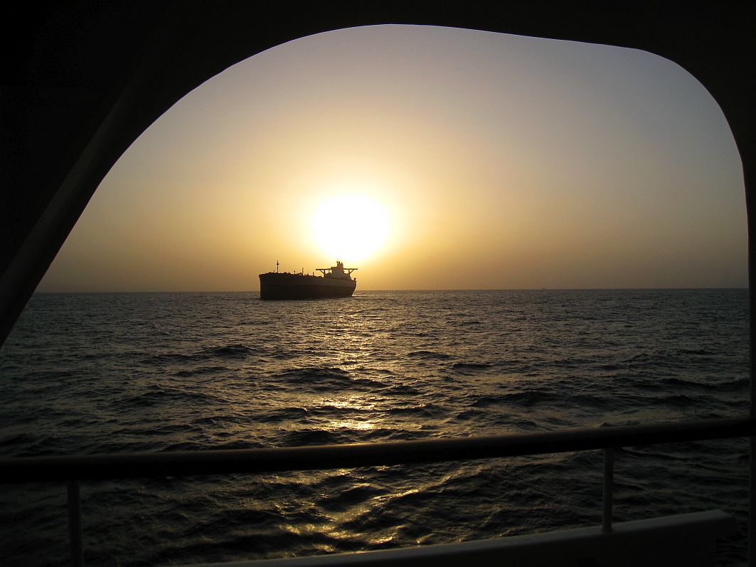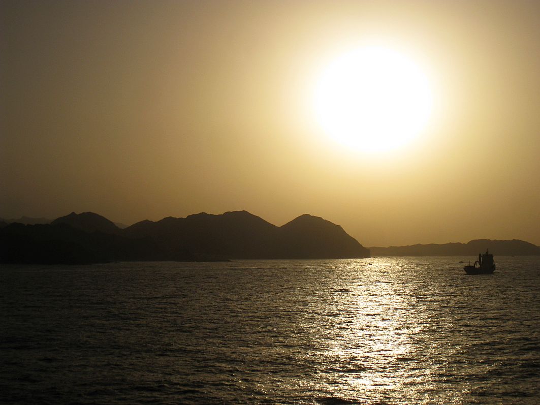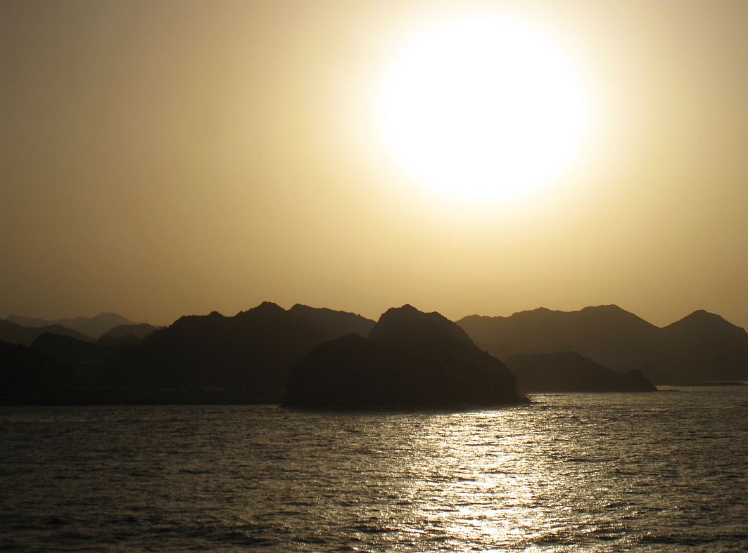 Den Abschied vom Oman krönt ein zunächst Bilderbuch-Sonnenuntergang, doch bevor die Sonne in die See eintauchen kann, versteckt sie sich dann doch im Dunst.