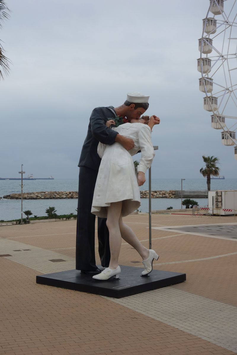 Wir freuen uns jetzt eher über diese Skulptur direkt hinter dem Fort. Das küssende Paar, die gegenständliche Nachstellung eines berühmten Fotos. Dieses sich küssende Liebespaar, welches sich so sehr über die bedingungslose Kapitulation Japans im 2. WK freut.