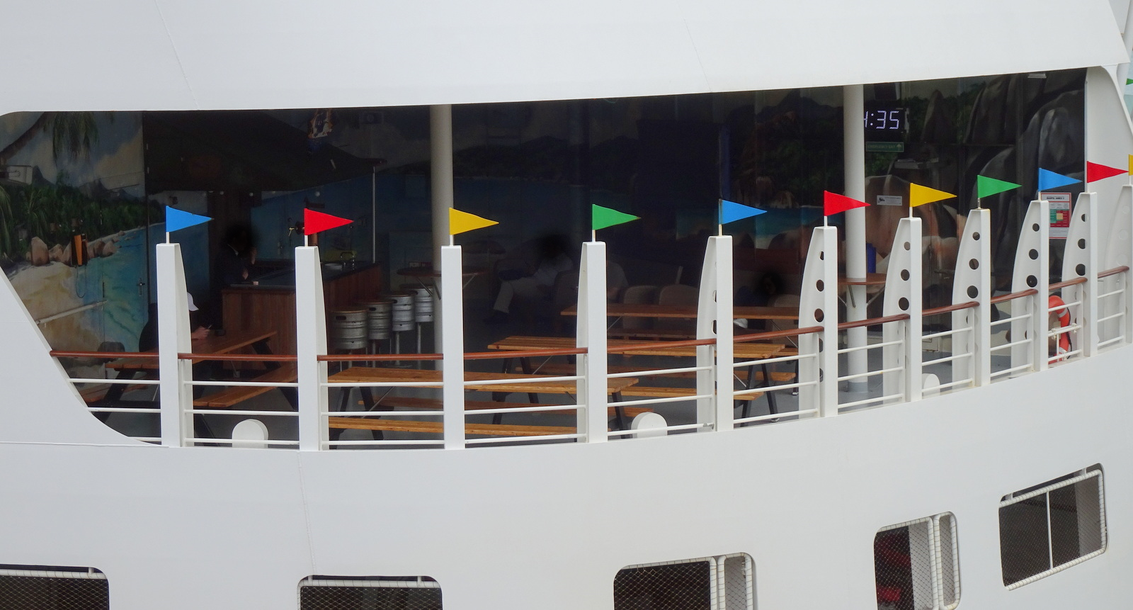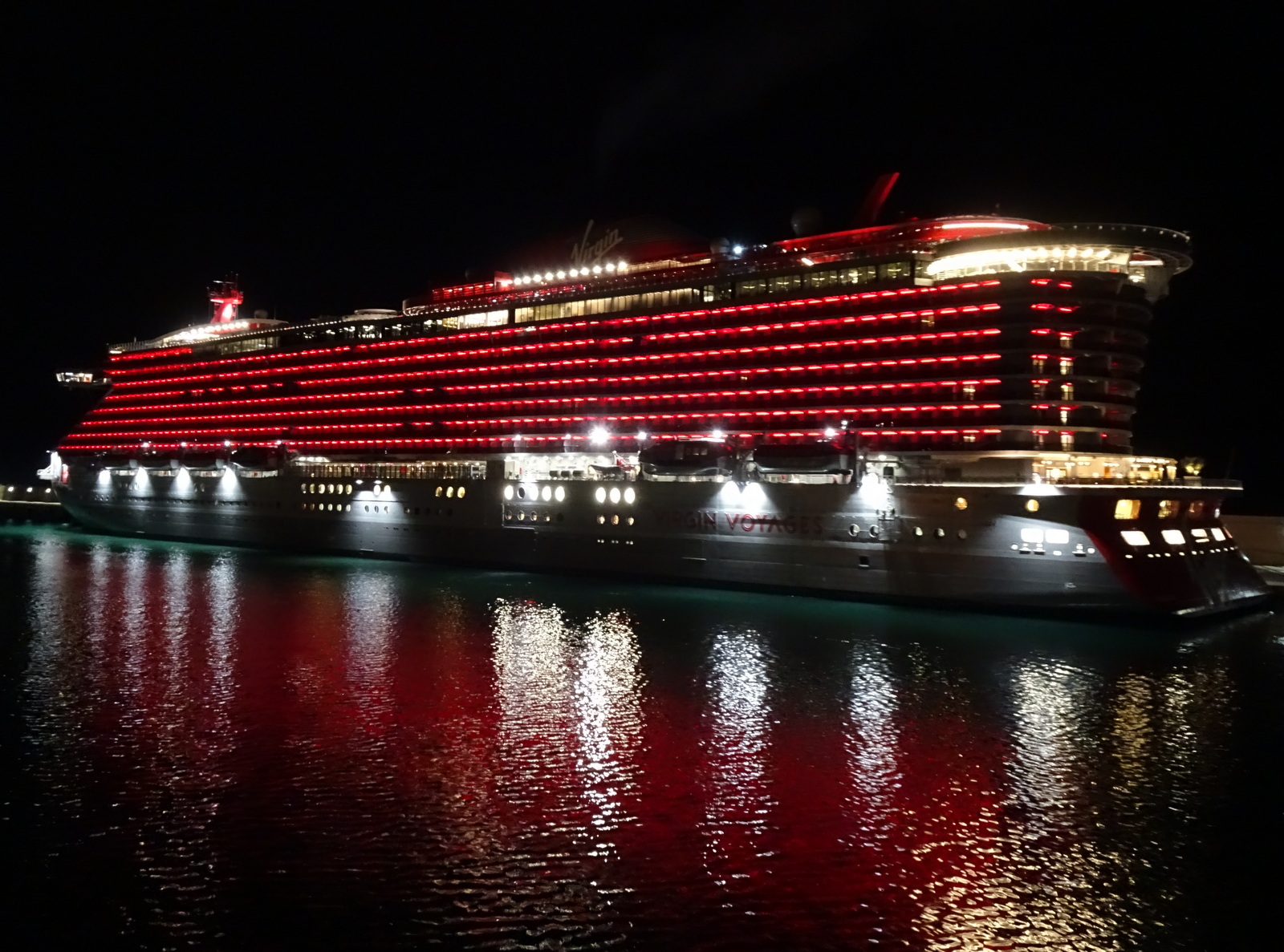 Das einzige Kreuzfahrtschiff waren wir heute hier. Außer dieser Virgin Voyager die wir nun passieren, auf der im Moment aber wohl keine Passagiere sind. Was ist das für ein komisches Schiff?