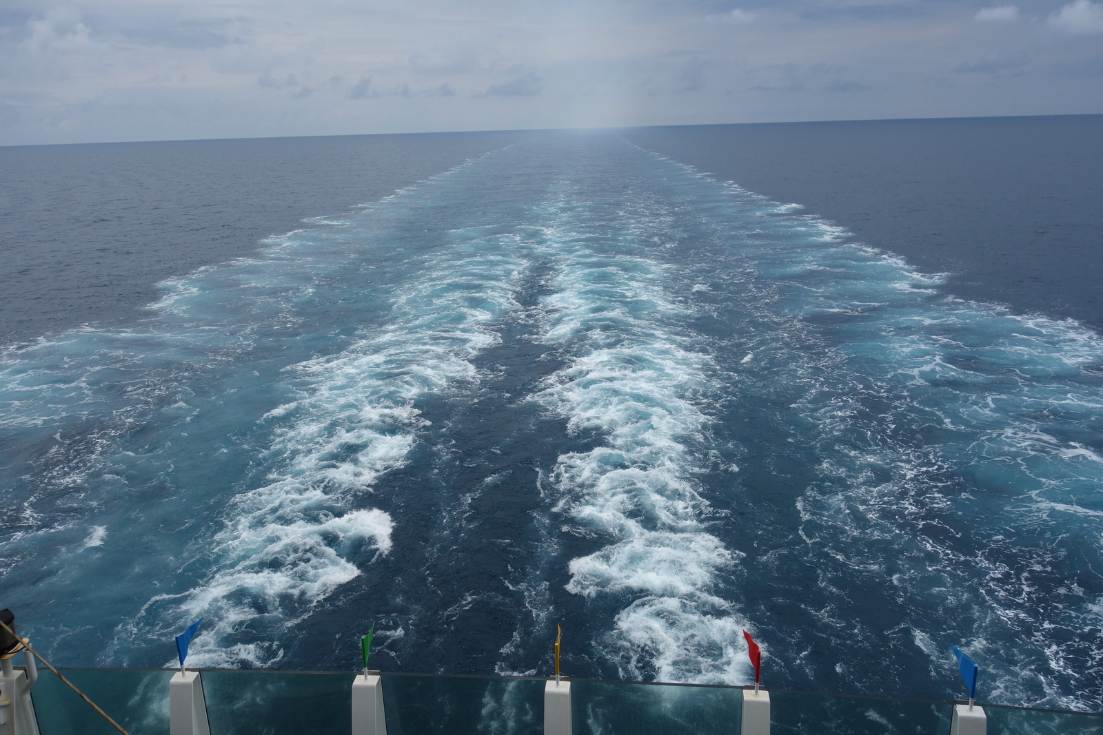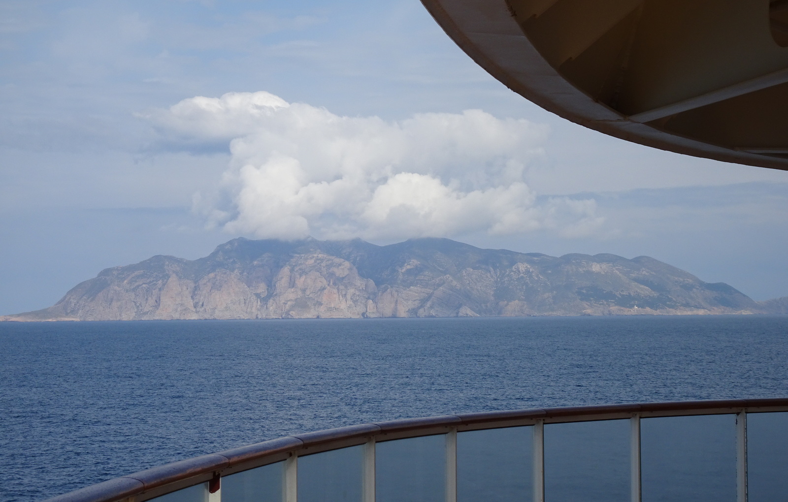 Kein Schiff, kein Land, keine Sonne in Sicht. Nichts außer Wasser. Gegen Mittag aber lässt sich dann nicht nur zaghaft die Sonne, sondern auch das erste Land blicken. Eine Insel ist es offenbar, an welcher wir backbord recht nah vorbeifahren. Da die nautischen Infos im Bordportal mal wieder nicht funktionieren muss Google Maps das Rätsel lösen. Es ist wohl die Insel Maritimo welche sich vor der Westspitze Siziliens recht hoch aus dem Meer erhebt und mit ihrer Spitze eine Wolke von der Sonne fernhält.
