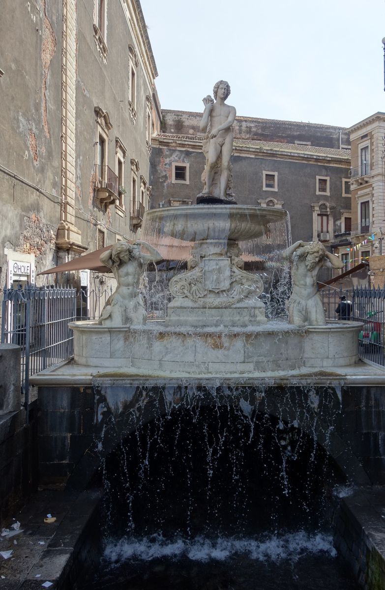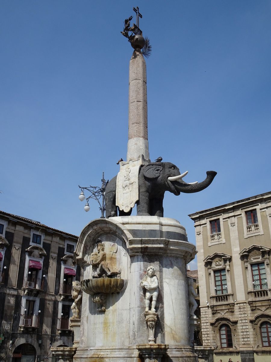 Nach viel Fisch, Muscheln, Krabben, einem bisschen Fleisch in Form von Lämmern, Gedärmen und Pansen, sowie auch Gemüse, sind wir einmal um den Block geschleppt und stehen wieder auf dem Piazza und in der Mitte davon beim Fontana dell` Elefanti, dem Elefantenbrunnen, dem Wahrzeichen von Catania.