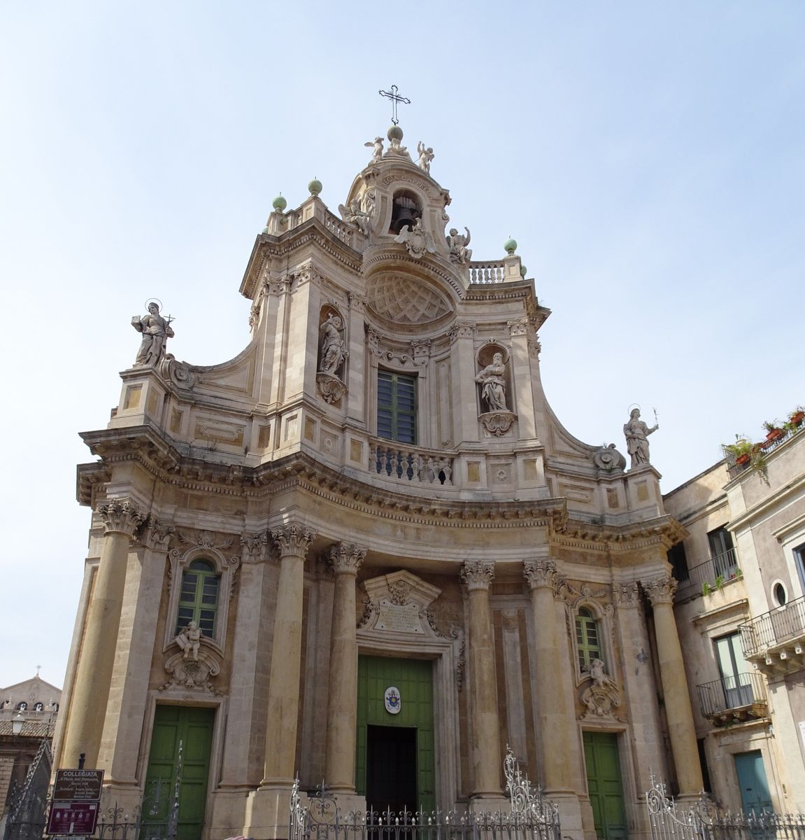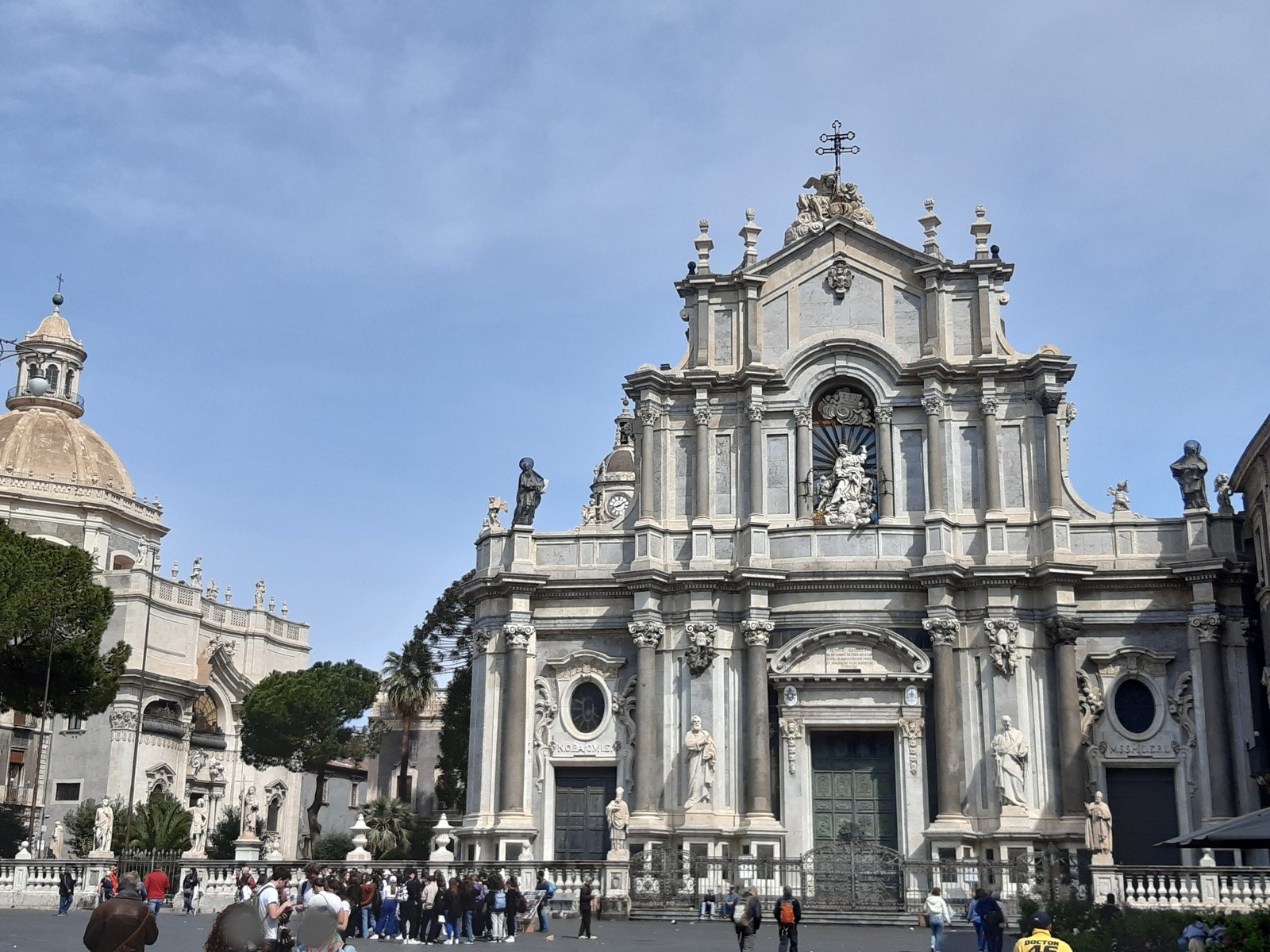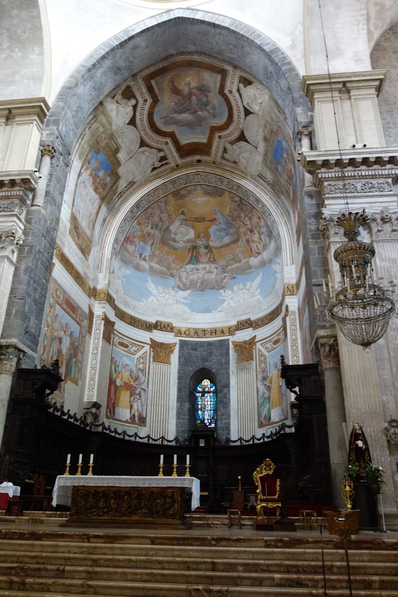Dann also ab in die Kathedrale Sant`Agata, die den Namen der Schutzpatronin Catanias trägt, der heiligen Agata eben, und deren Reliquien hier lagern. Die ist zu diesen Ehren gekommen, weil sie sich damals gegen die Besatzer gewandt und dem heidnischen Stadthalter die Heirat verwehrt hat. Das erregte mehr als dessen Missfallen, er wurde nachtragend und es endete mit dem Feuertod. Das ganze Martyrium, mit Ausnahme der Verbrennung, passiert an der Stelle, wo heute die Chiesa di San Biagio steht. Das ist dieses verhüllte Gotteshaus beim Amphitheater wo wir eben daran vorbeigefahren sind und außer Planen nichts zu sehen war.