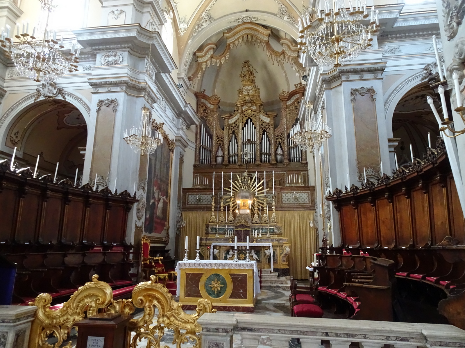 Hier kann man sicher nichts verkehrt machen und Touristen sind willkommen, zumindest solange man auf touristischen Pfaden bleibt und nicht wie gerade unfreiwillig, einen auf Land und Leute macht… Einmal umgeschaut in dieser Chiesa della Badia di Sant`Agata und dann hält die Sponsoren wohl tatsächlich nicht der Zugangseintritt von 5 Euro davon ab, uns den Rundblick von der Kuppel zu gönnen, sondern die Tatsache, dass es -fast erwartungsgemäß- in diesem alten Gemäuer keinen Aufzug gibt. Die paar Stufen schrecken die dermaßen ab, dass uns jetzt der sicher tolle Ausblick verwehrt bleibt. Nun gut, so billig kommt ihr uns nicht davon. In Neapel kann man alternativ auf das Dach der Kathedrale. Und da gibt es einen Lift!